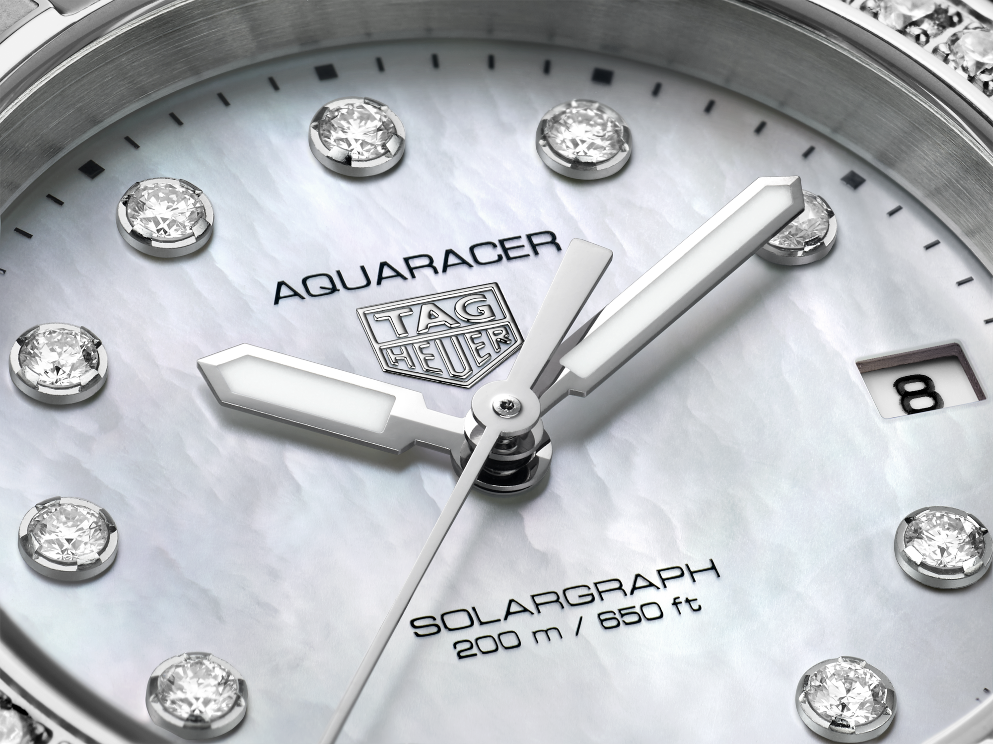 The luminous mother-of-pearl dial features eleven diamond (0.15cts) indexes, harmoniously complementing the fine-brushed, polished steel case, water-resistant to 200 meters.
