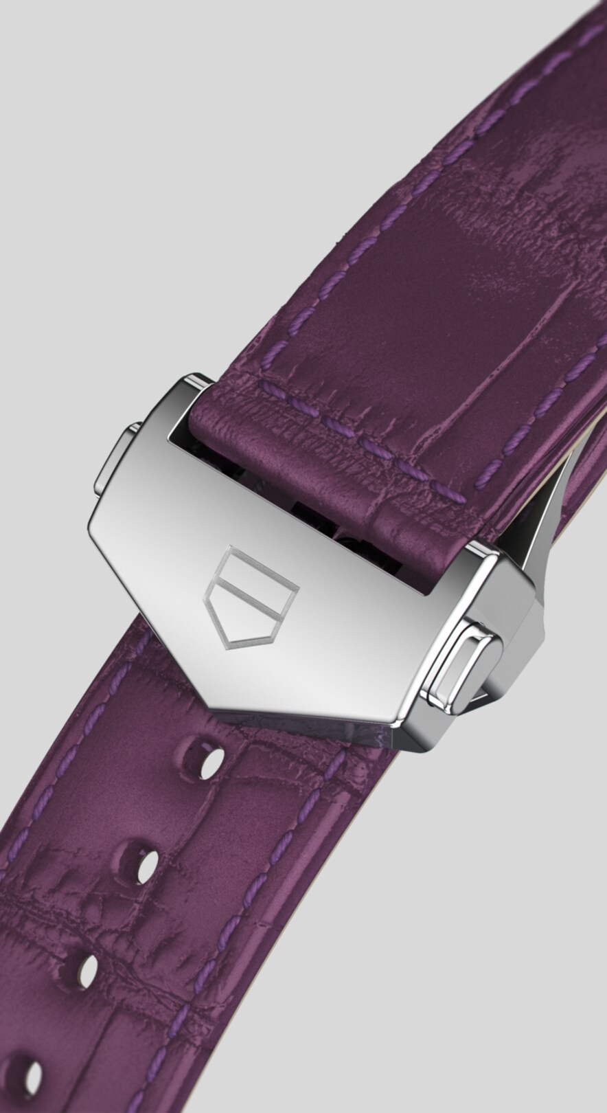 The eye-catching purple strap is top-stitched alligator. It snugly closes by means of a polished steel folding clasp with double safety push-buttons and a TAG Heuer shield engraving.