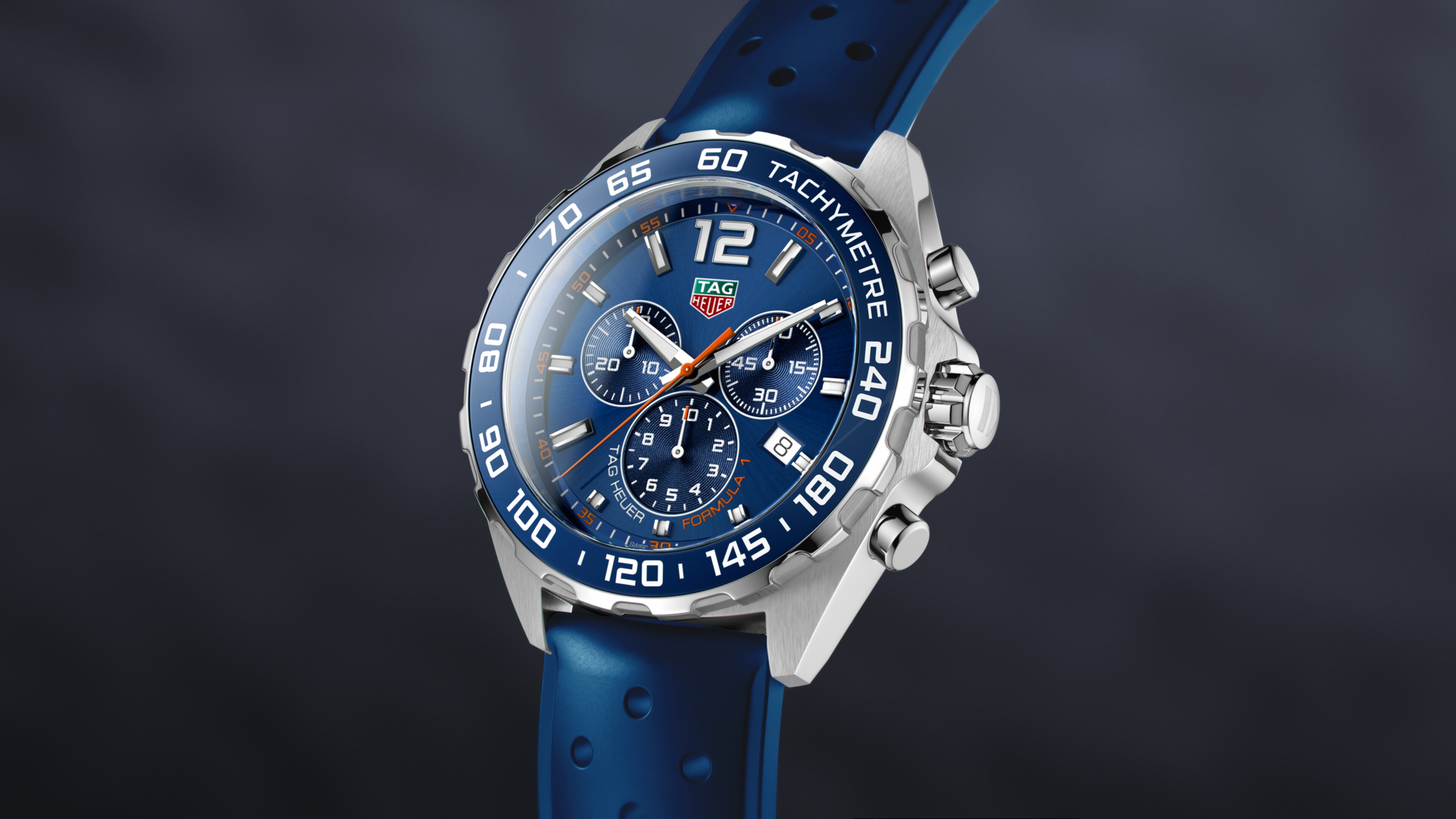 Featuring an energetic blue dial with orange highlights and a sturdy 43 mm steel case rated to 200 m, this chronograph is in pole position.