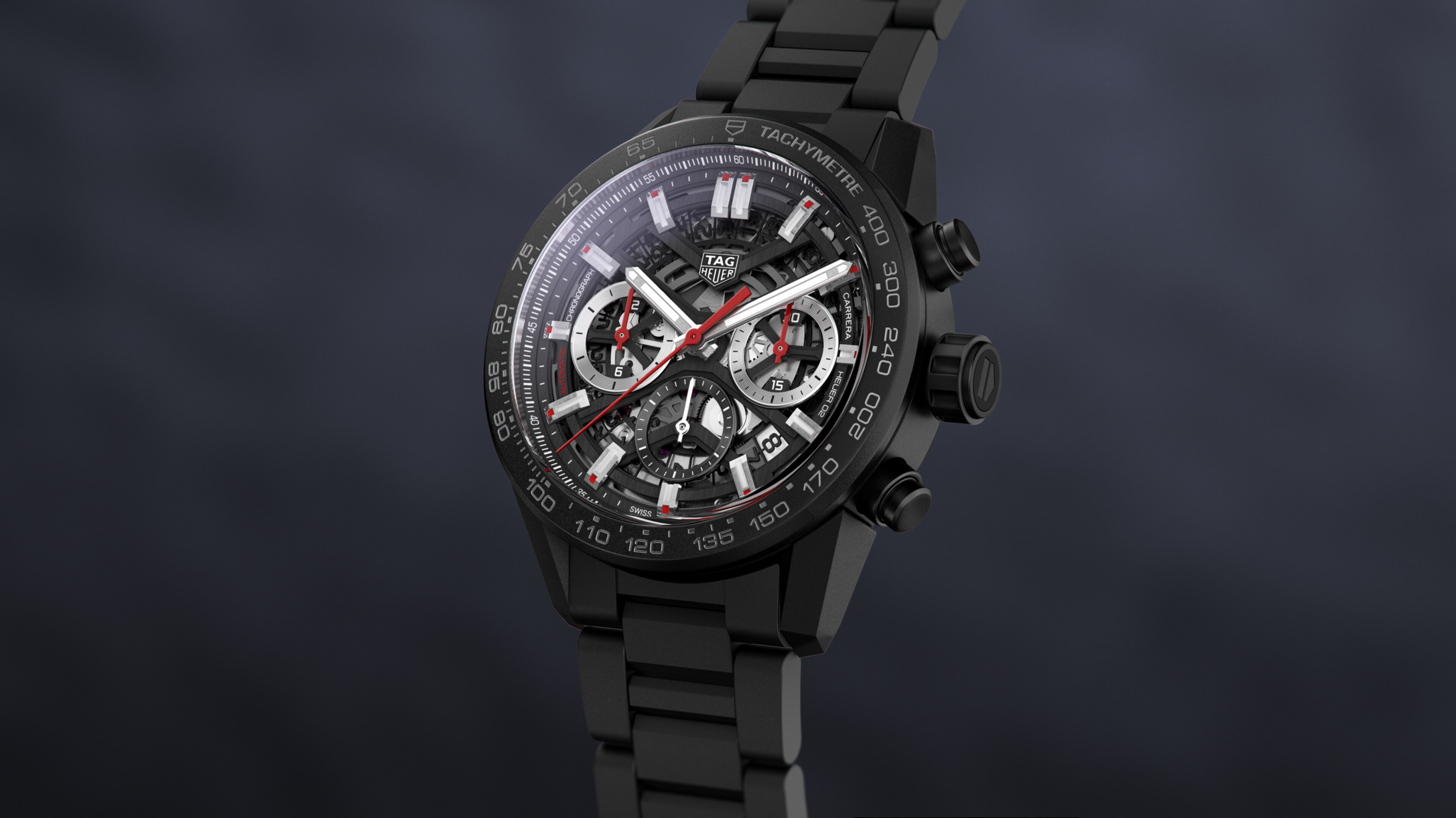 Automatic, 43 mm, Ceramic CBG2090.BH0661An automatic chronograph with black skeleton dial. Its case, lugs, tachymeter bezel and bracelet are in black ceramic. The Manufacture Automatic movement Heuer 02 comes with a 80 hours power reserve.