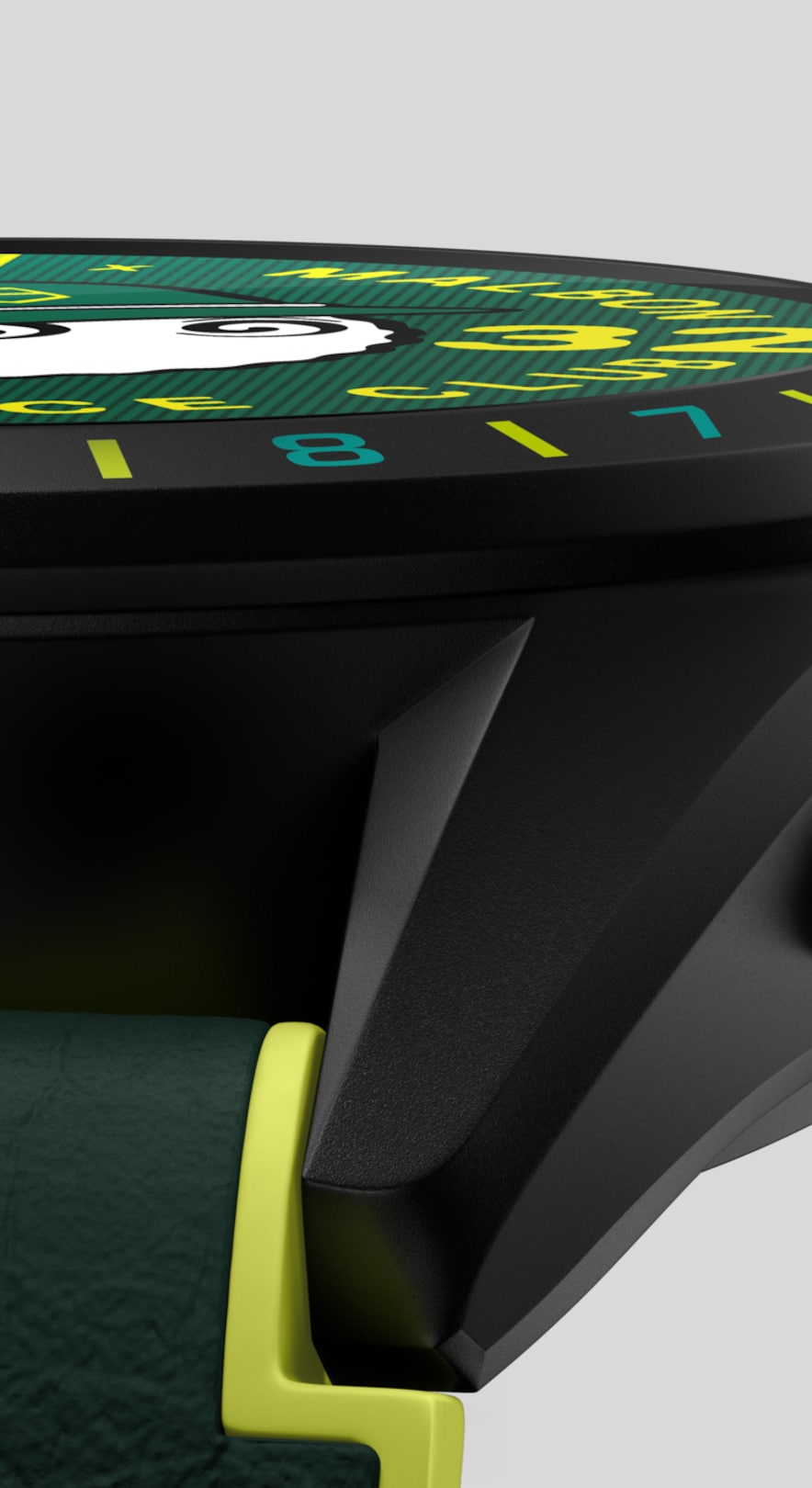 Das Gehäuse aus Titan Grad 2 mit schwarzer DLC-Beschichtung ist mit einer dynamischen Lünette mit 18 Löchern versehen, während die leuchtend grünen und hellgelben Farben des Armbands jeden Schwung zu einem individuellen Statement machen.
