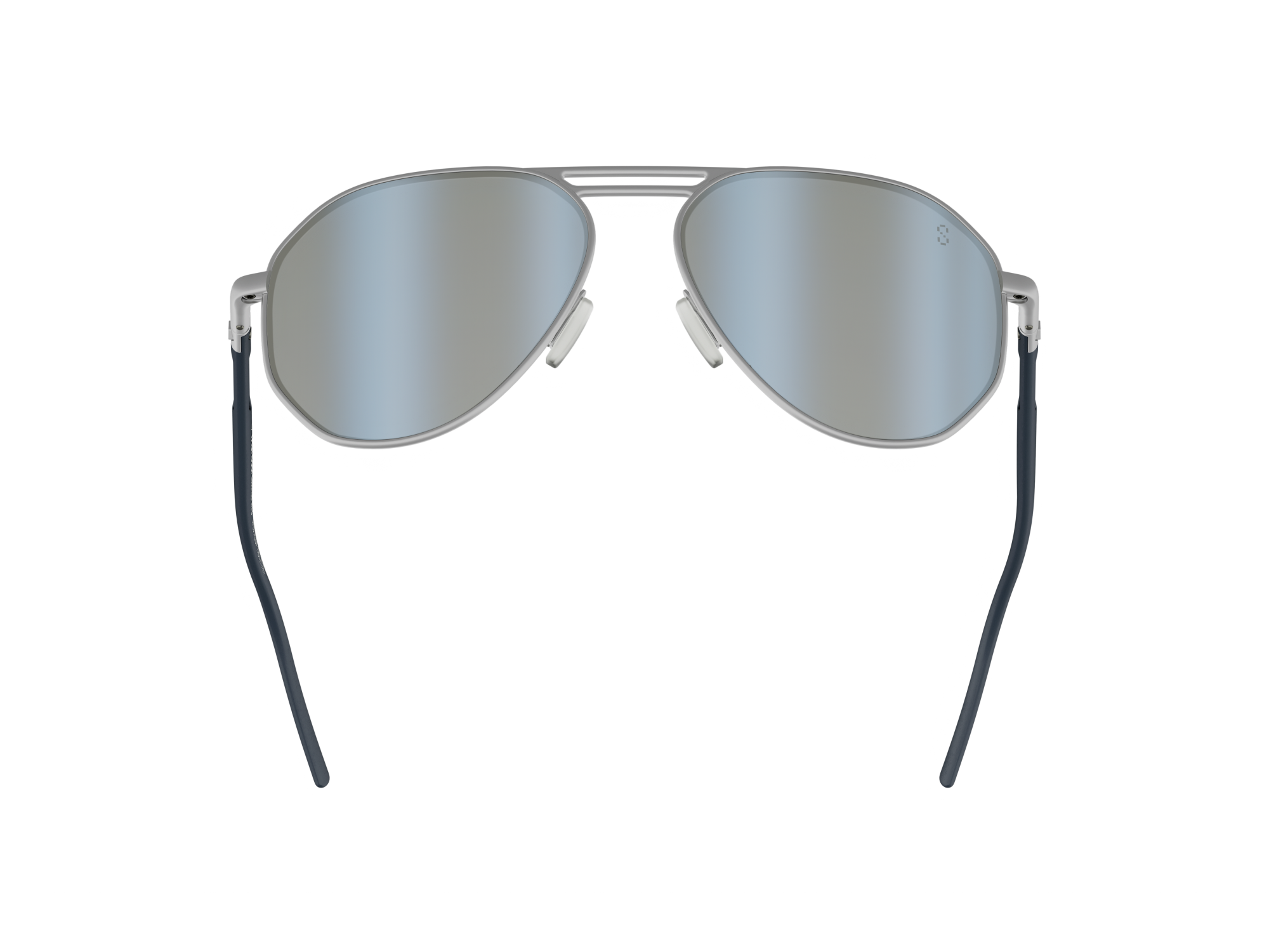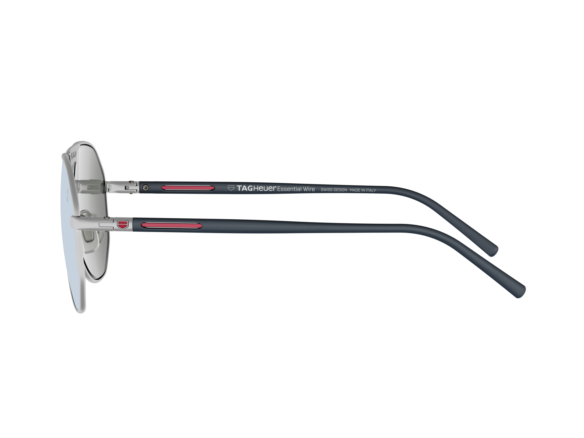 Das gerahmte Gestell wurde aus galvanisiertem Edelstahl mit mattem Palladium-Finish gefertigt, was ihm ein edles, technisches Erscheinungsbild verleiht. Ein hoher, doppelter Steg unterstreicht die grafische Identität der Brille, während die mit dunkelblauem Kautschuk beschichteten Bügel mit sichtbarem Metallkern für Flexibilität sorgen und einen minimalistischen Farbakzent setzen. Die verstellbaren Nasenpads aus Bio-Nylon mit Kautschuküberzug gewährleisten Tragekomfort und sind als subtiler Hinweis auf die Marke mit einem lackierten TAG Heuer 3D-Logo versehen.