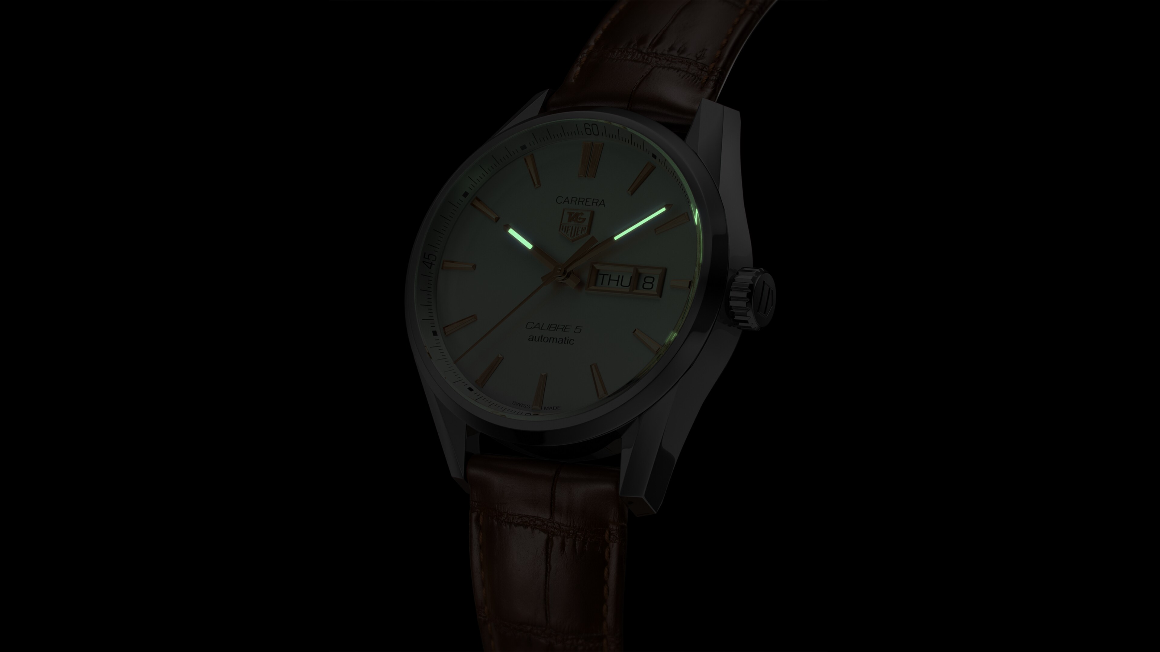 Das weiße Zifferblatt ist der perfekte Hintergrund für den Glanz des Sekundenzeigers, der Indizes, der Zeiger für Stunden und Minuten, das TAG Heuer Logo sowie das Wochentags- und Datumsfenster bei 3 Uhr aus Roségold.