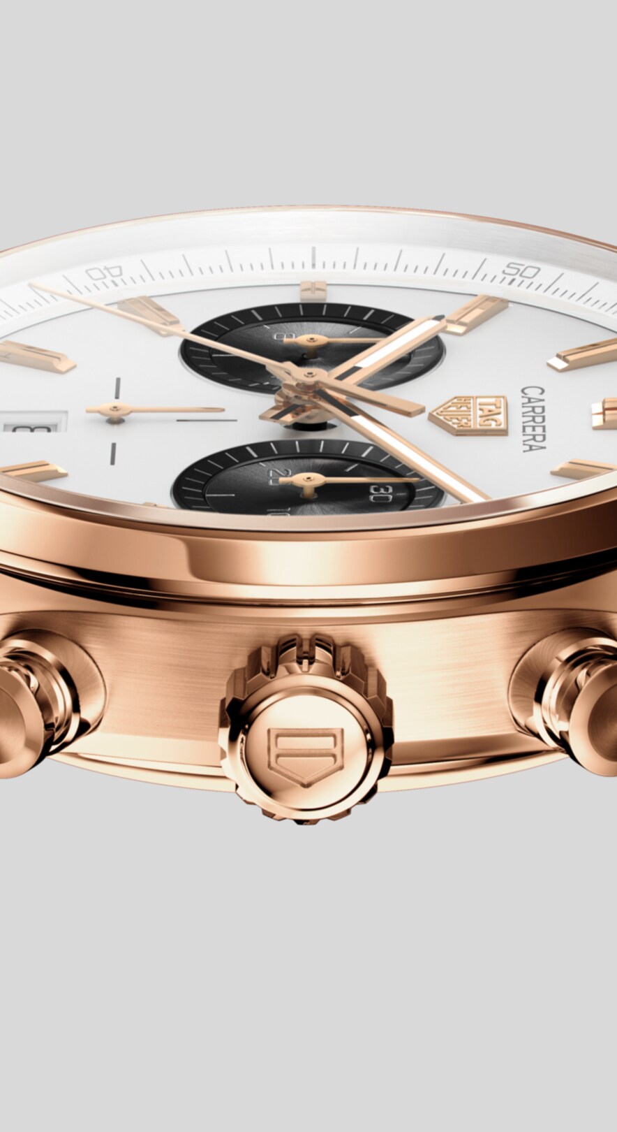Mit seinem schlanken Design und dem leicht ablesbaren Zifferblatt zollt der elegante Chronograph dem Heuer Stil ebenso Tribut wie Jack Heuers Liebe zum Detail und zur Präzision. Sie ist aus 18K Roségold gefertigt, seinem Lieblingsmaterial, das er speziell für die Uhren auswählte, die er den Rennfahrern als ganz besondere Glücksbringer schenkte.