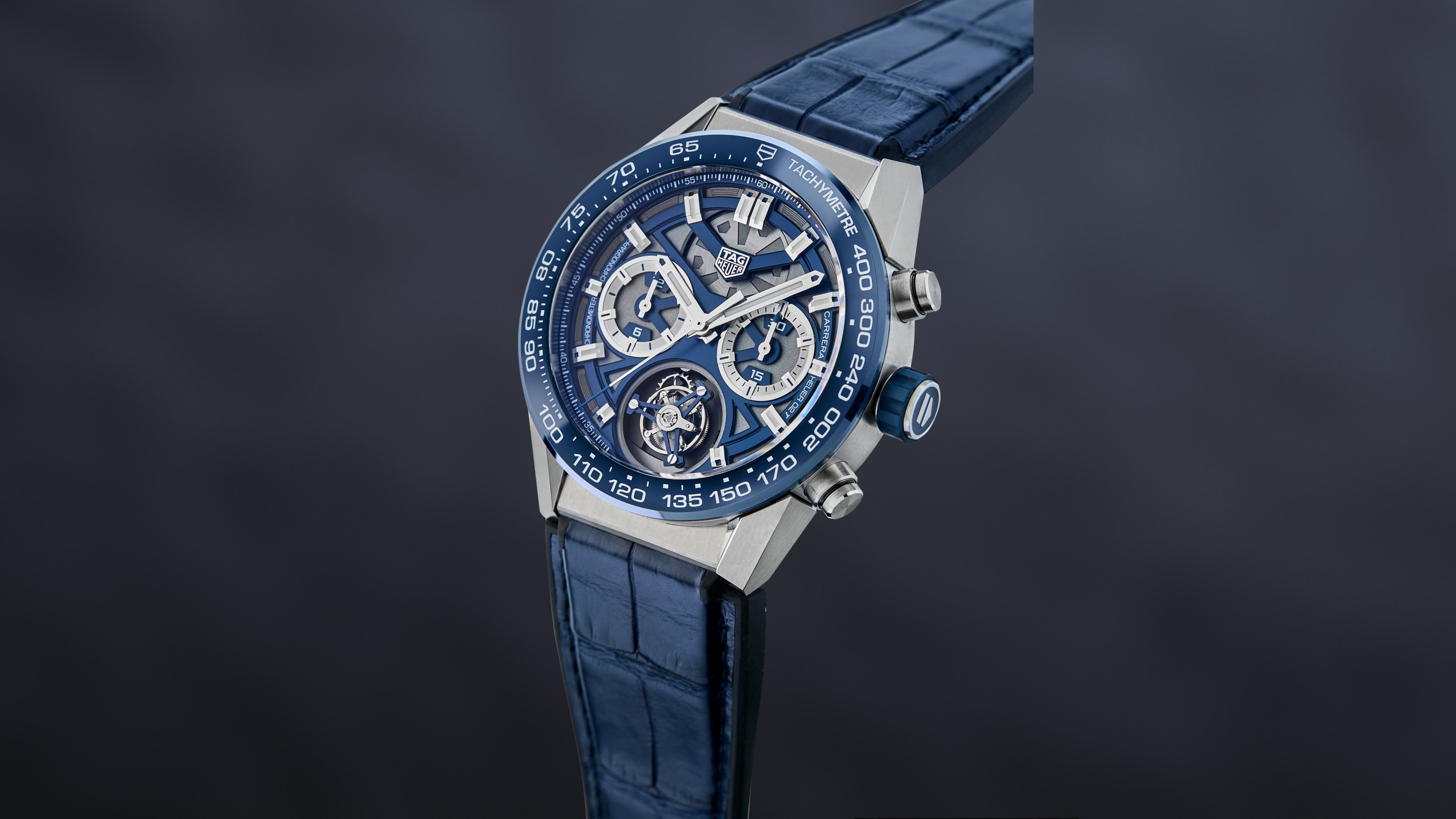 Striking blue finishing is applied to the column wheel, the dial and tourbillon bridge of this Calibre H02T.