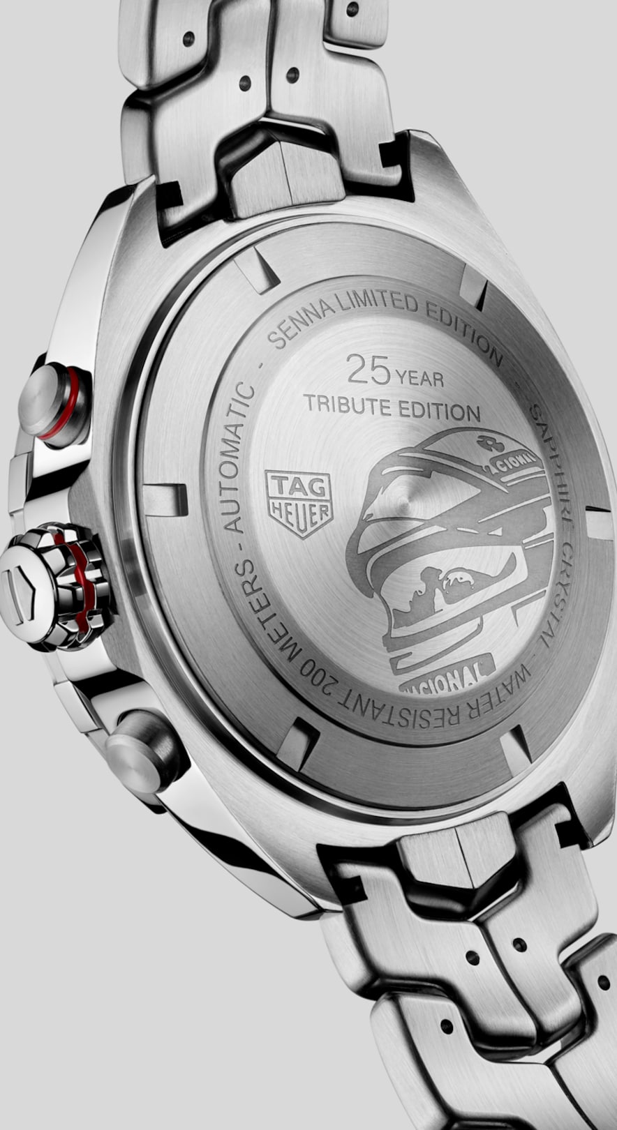 Automatik, 44 mm, Edelstahl CAZ2017.BA0647Die 25 Jahre Ayrton Senna Tribute Edition ziert eine Gravur des Helms der Rennlegende auf dem verschraubten Gehäuse aus Edelstahl und sein Name in Weiß bei 1 Uhr auf der schwarzen feststehenden Lünette aus polierter Keramik mit Tachymeterskala. Sie verfügt zusätzlich über ein S-förmiges Armband, zu deren Entwicklung er beitrug.