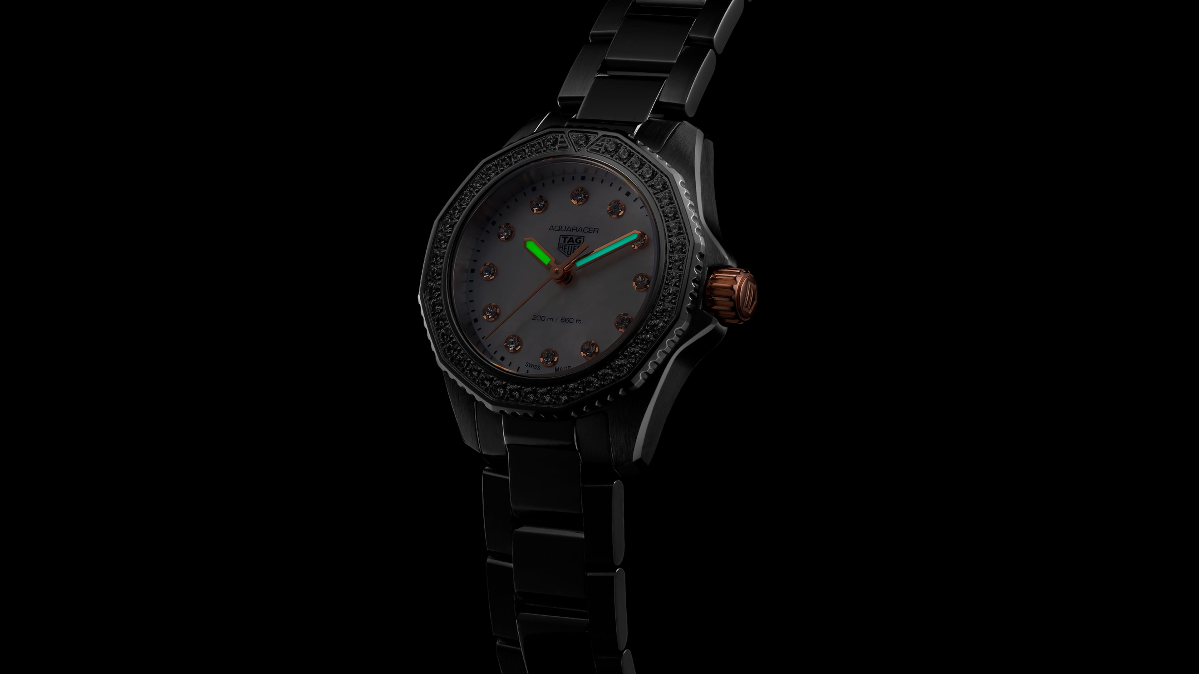 Quartz, 30 mm, Steel WBP1451.BA0622Shimmering gems and bright white mother-of-pearl adorn this prestigious 30mm TAG Heuer Aquaracer. Its delicately crafted yet enduring design in steel has what it takes to take on any challenge with absolute sophistication.