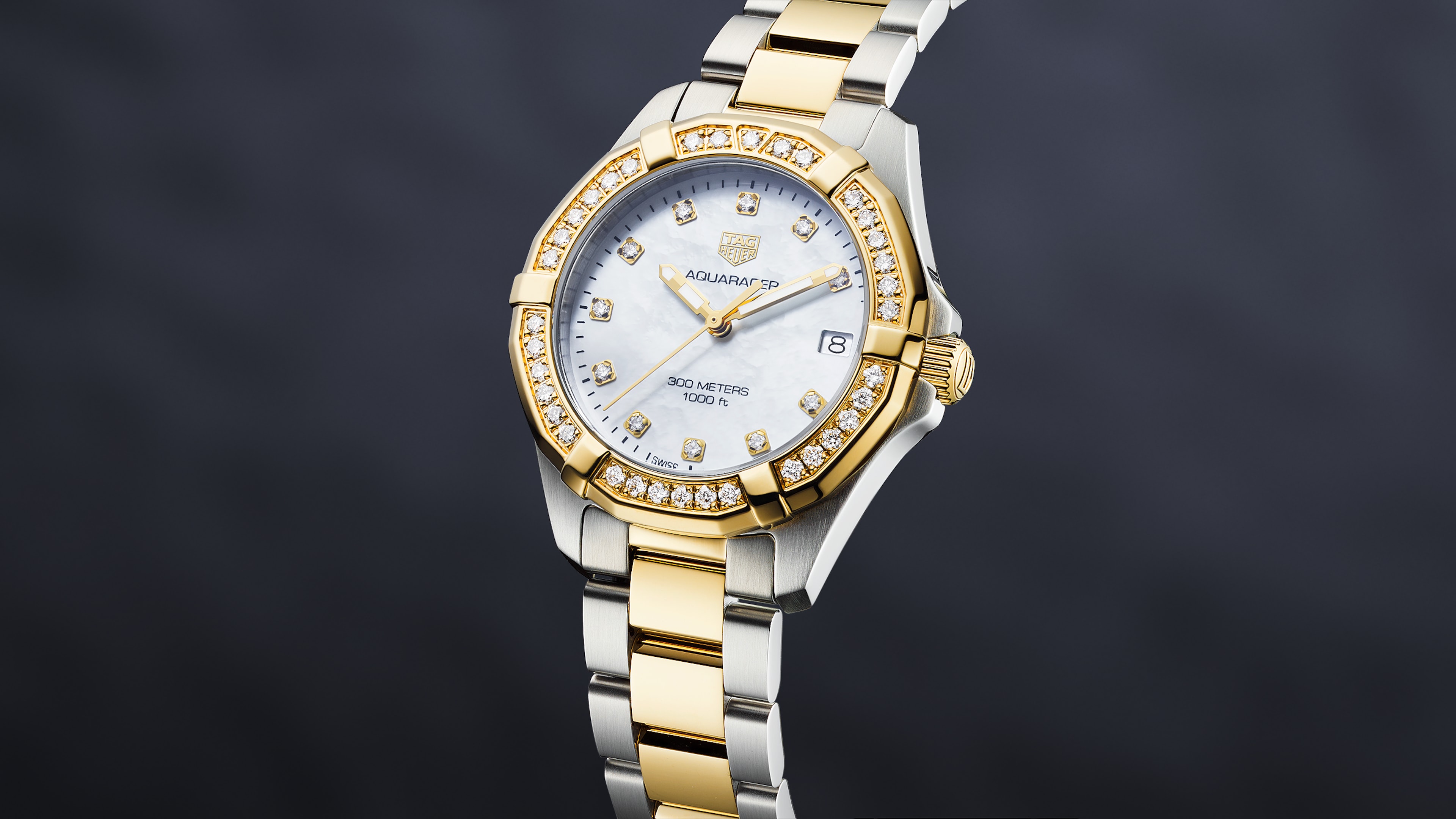 Quartz, 32 mm, Steel WBD1323.BB0320A dazzling diamond and gold edition of the classic Aquaracer Lady. The mother-of-pear dial is adorned with 11 hand-applied diamonds. A further 35 diamonds circle the imposing 18K 2N gold-plated unidirectional turning bezel. Head-turning glamorous, yet rob