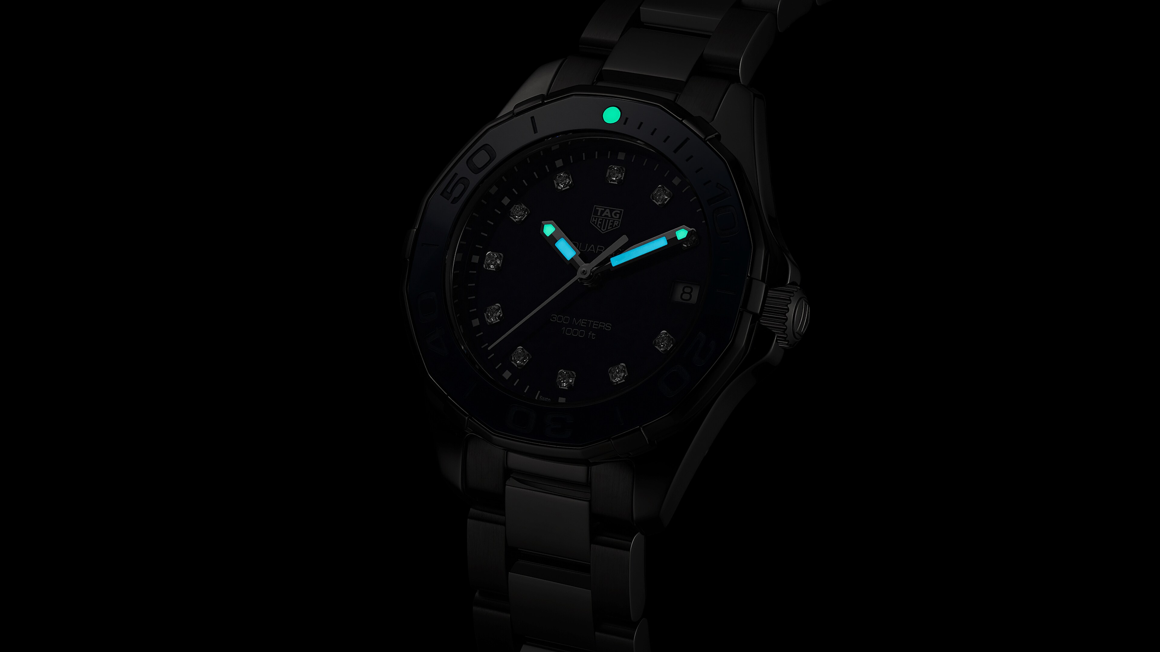 Quartz, 35 mm, Steel WAY131L.BA0748Glittering diamonds (0.1 CT) on a blue mother-of-pearl dial. A bezel of polished blue ceramic harder than steel. Featuring a steel folding clasp with double safety push-buttons and diver extension.