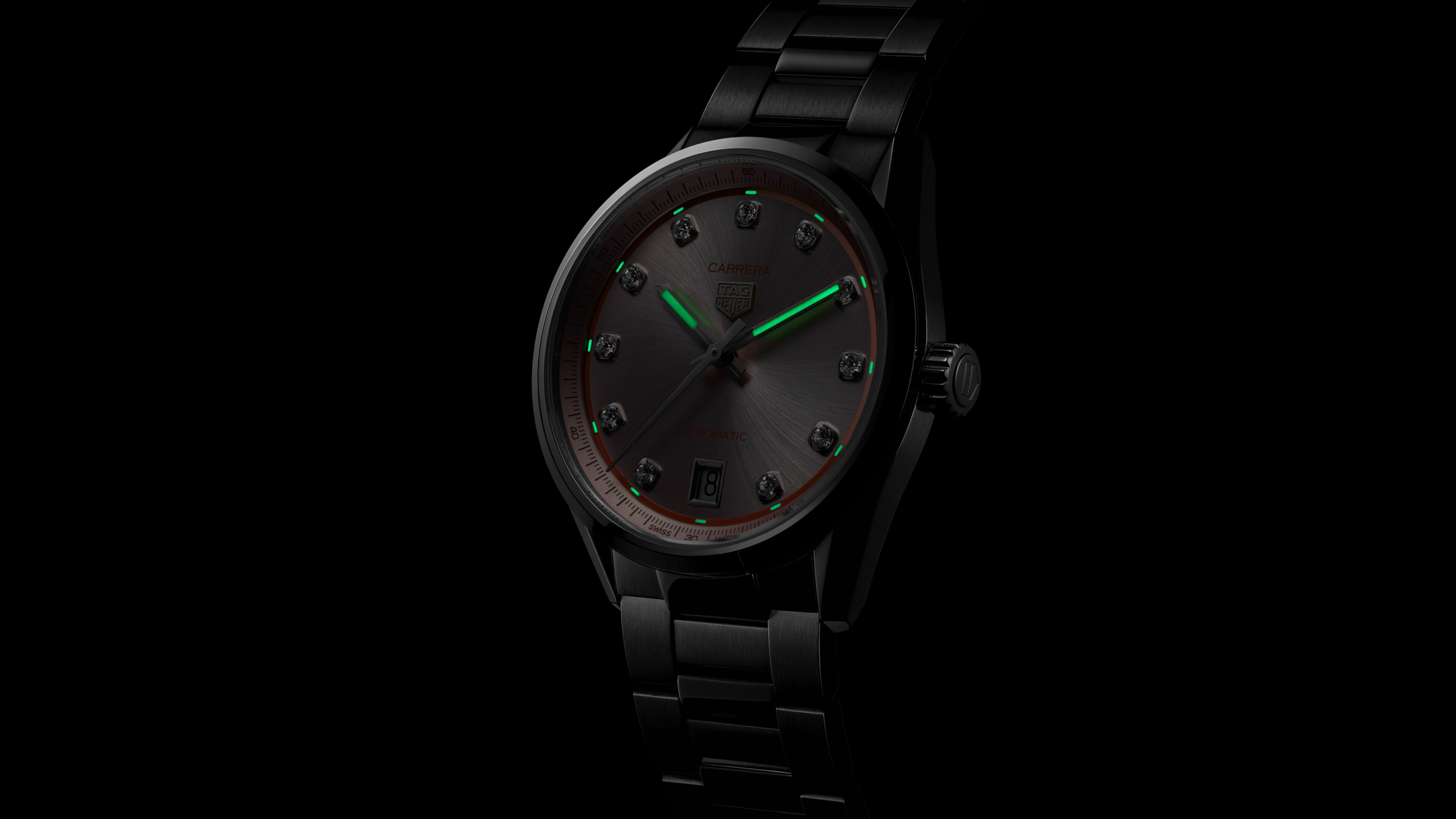 The powdery pink sunray-brushed dial creates a feminine and sophisticated look, accented by a gradient track circling the dial. Diamond-set indexes add a touch of luxury, embodying the spirit of the TAG Heuer Carrera.