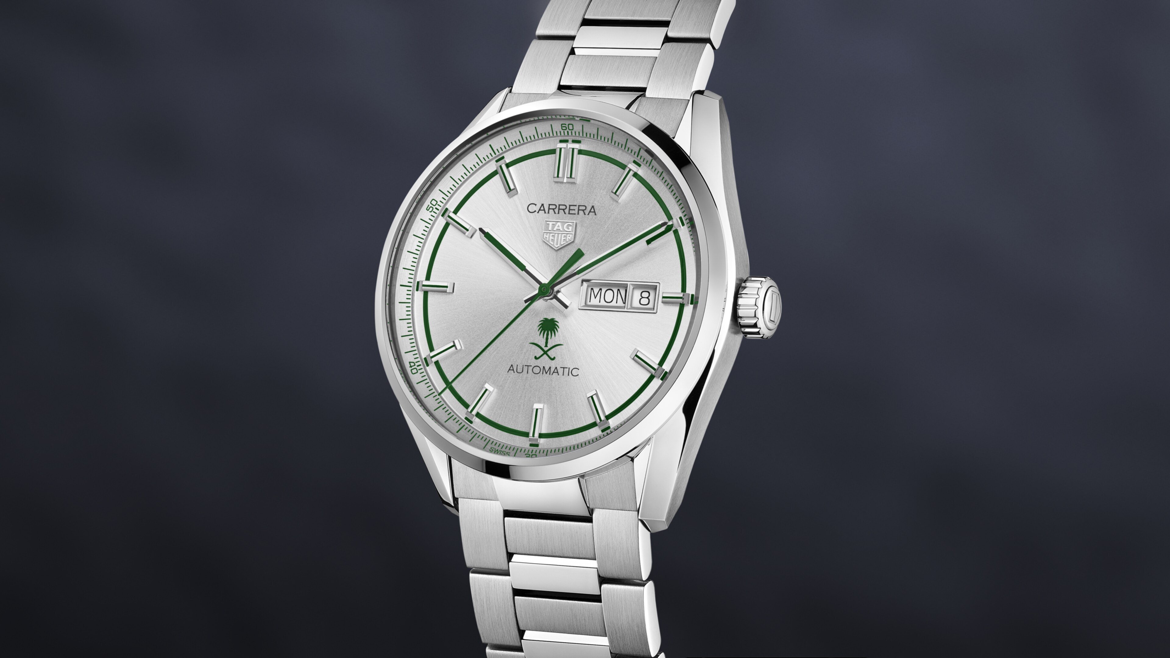 The 41 mm TAG Heuer Carrera KSA Limited Edition combines elegance and modernity. Saudi codes are seamlessly integrated in this creation with the national emblem and subtle green of the signature Saudi green on the dial.