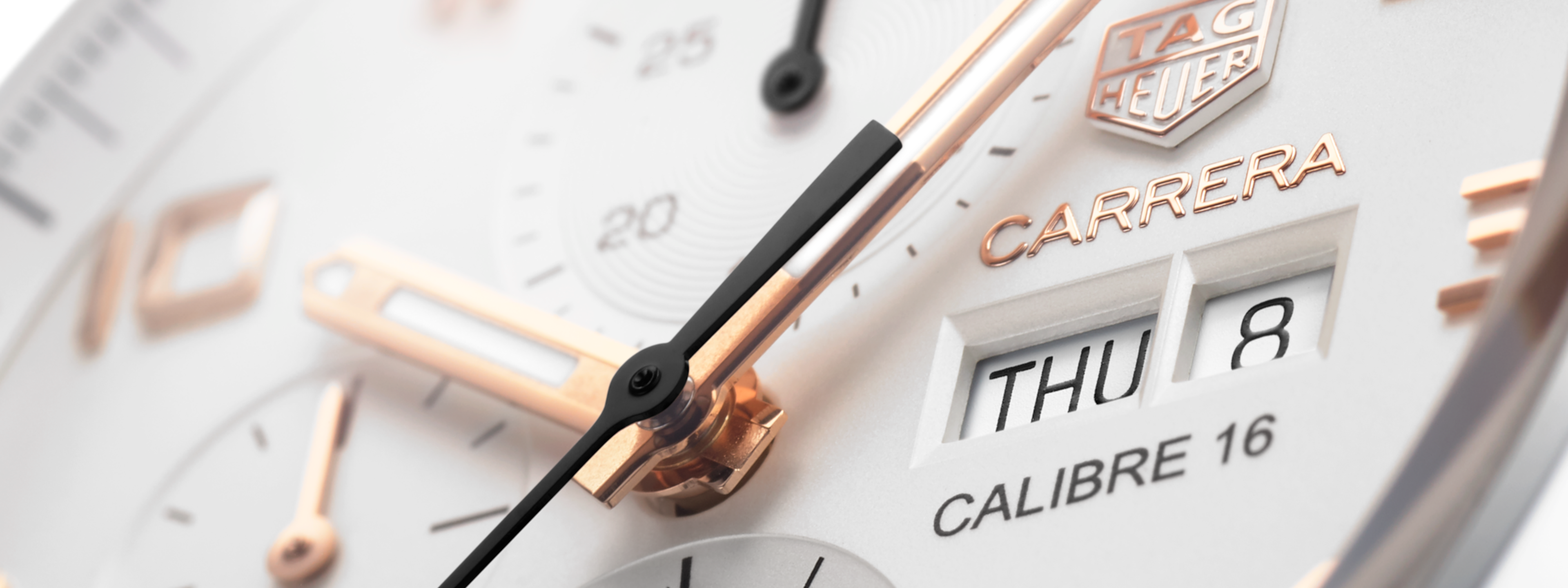 Automatic, 43 mm, Steel CV2A1AC.FC6380A classic TAG Heuer Carrera Day Date Chronograph: silver dial with rose gold details matched with a brown alligator strap. The highly legible design hearkens back to the collection’s roots: conceived for sportscar and racecar drivers who need to read a dial at a glance.