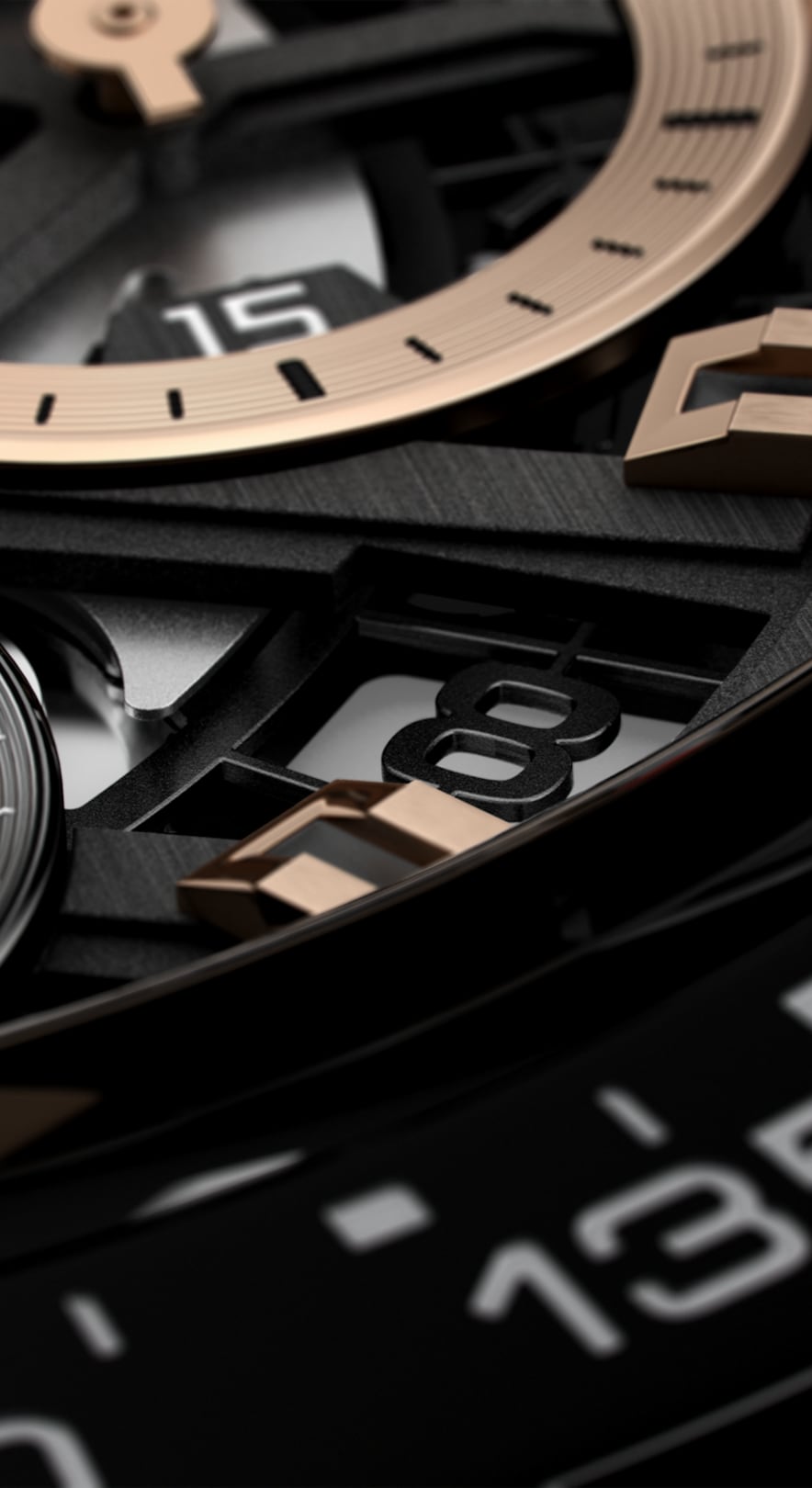 Automatic, 43 mm, Steel coated with PVD CBG2050.FC6426A stunning black steel and rose-gold 18K 5N TAG Heuer Carrera Heuer 02 with black alligator and rubber strap. This 43mm automatic chronograph has a movement with 80 hours power reserve, which is visible through the sapphire case back.