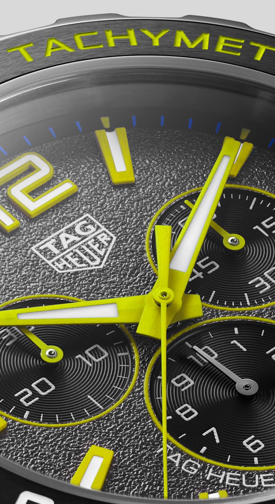 Matching the dial and bezel a high quality textile strap with eye-catching lime yellow accents, secured by a pin buckle for comfort on the race track.