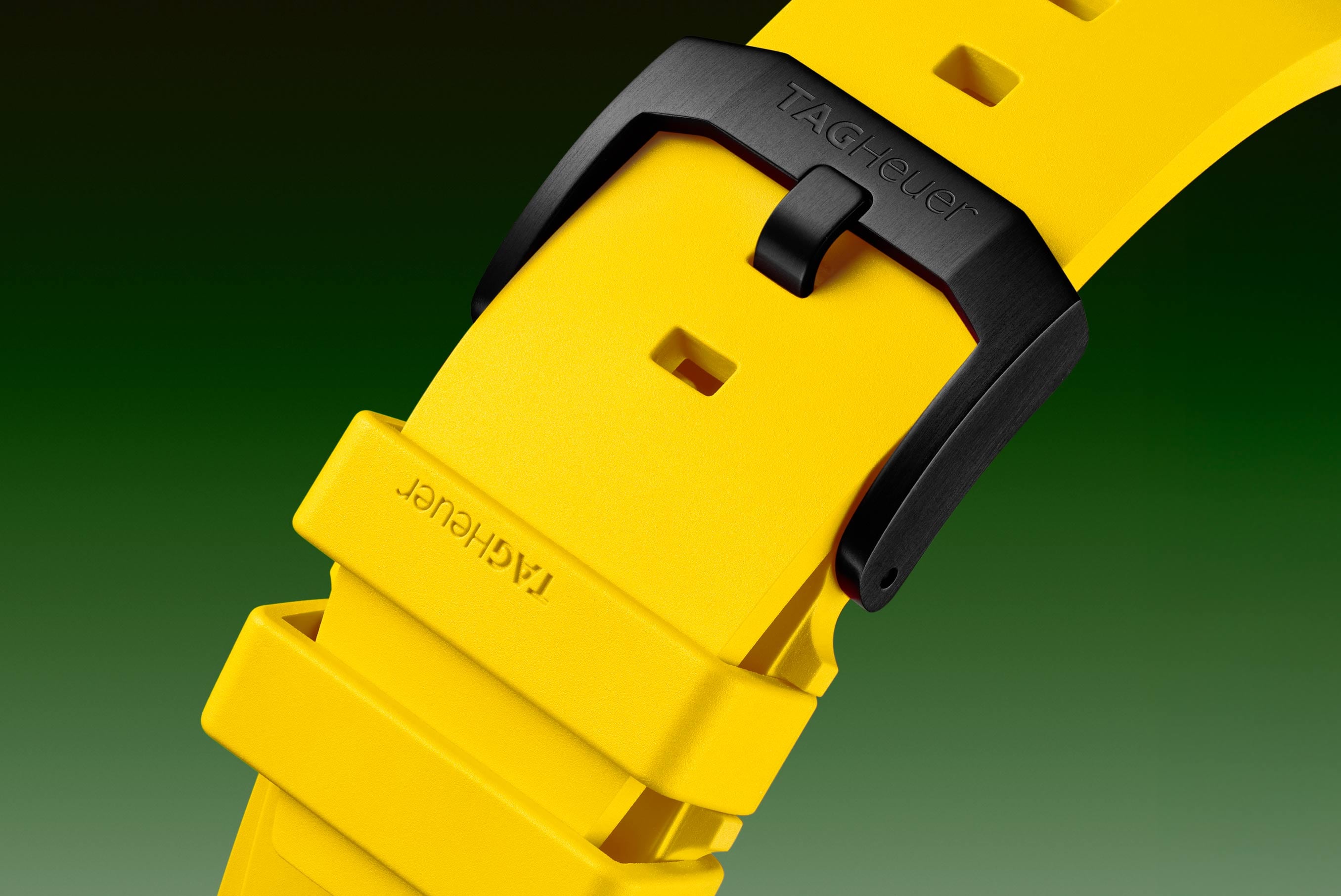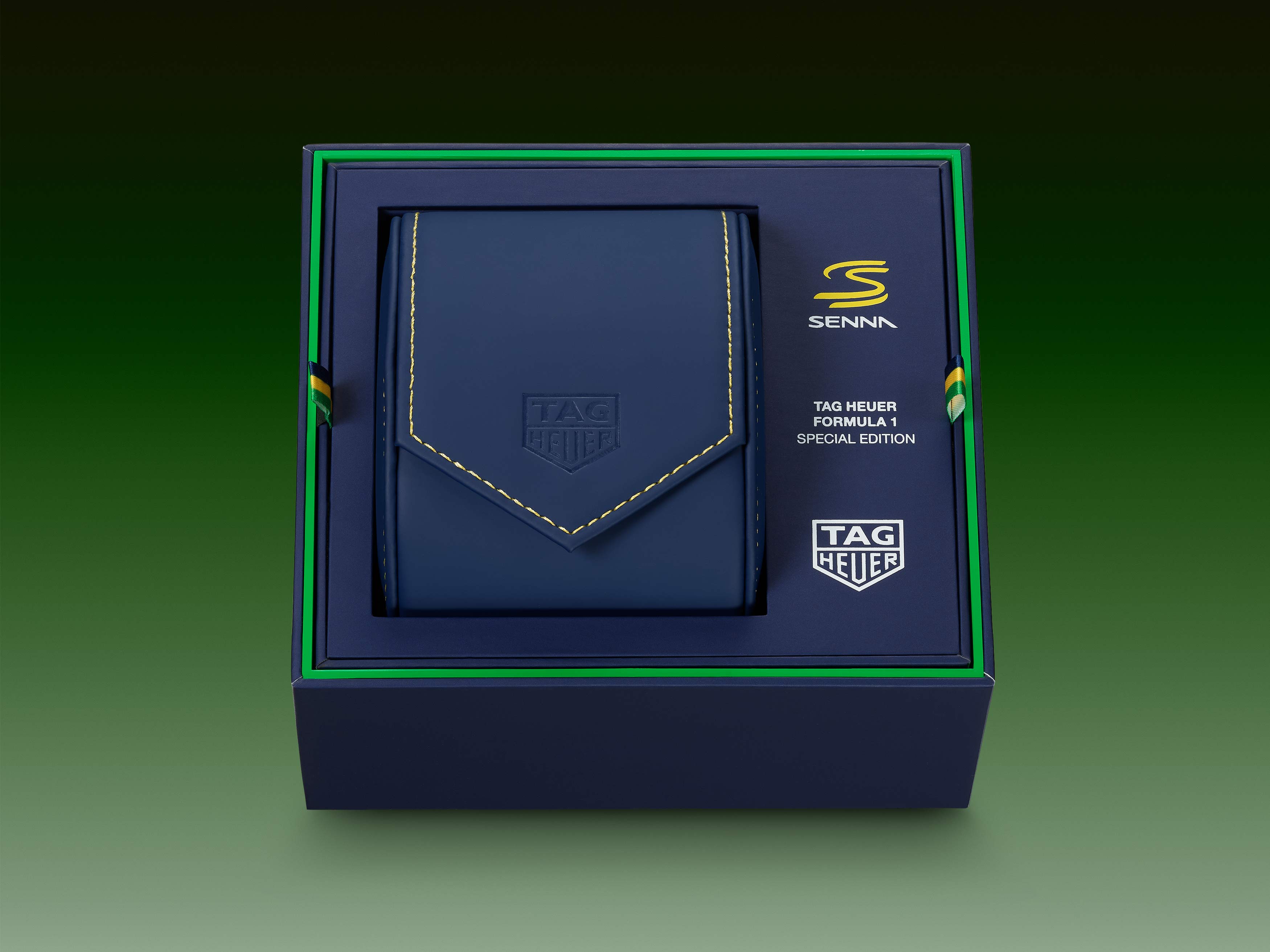 This special-edition casing combines deep blue with green and yellow detailing — a nod to Ayrton Senna’s helmet livery. The matching travel pouch, embossed with the TAG Heuer shield and stitched in yellow, completes this tribute to a legend of speed and endurance.