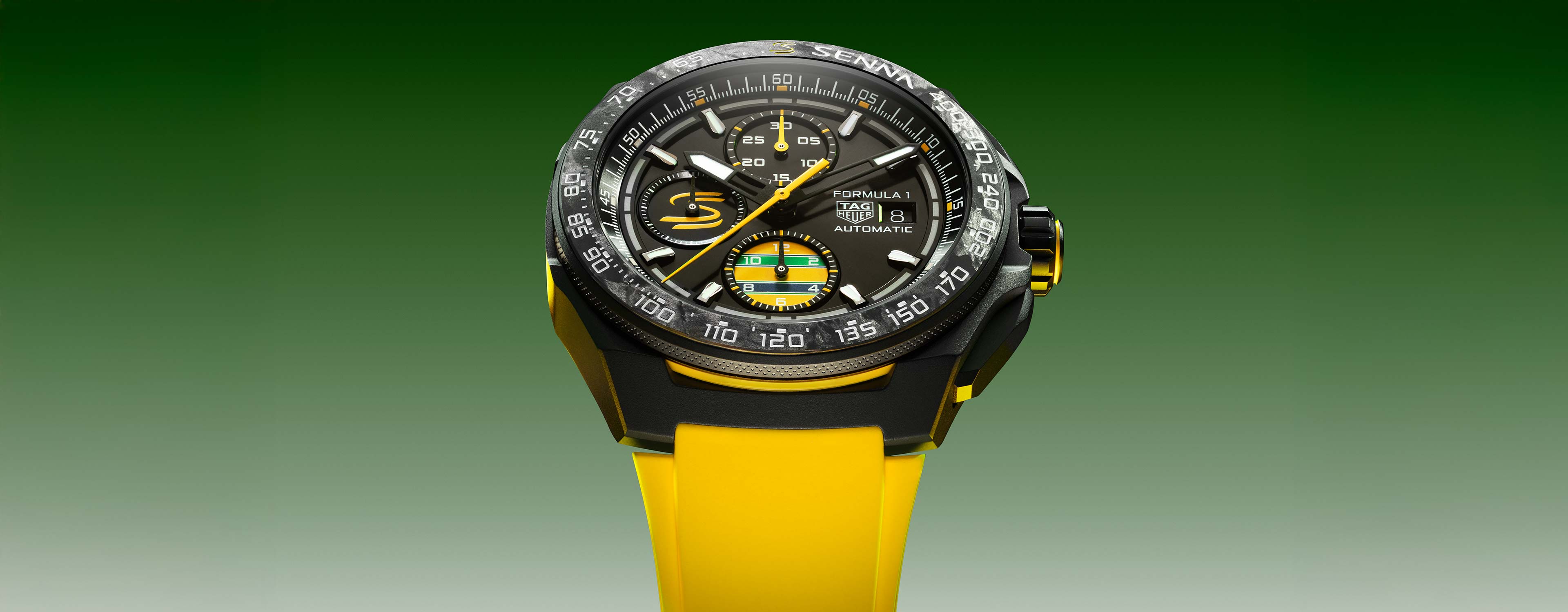 The black sunray dial, accented by the yellow, blue and green hues of Senna’s legacy, offers a striking aesthetic. The bold yellow lacquered central hand and subdial details reflect the legendary driver's fearless spirit.
