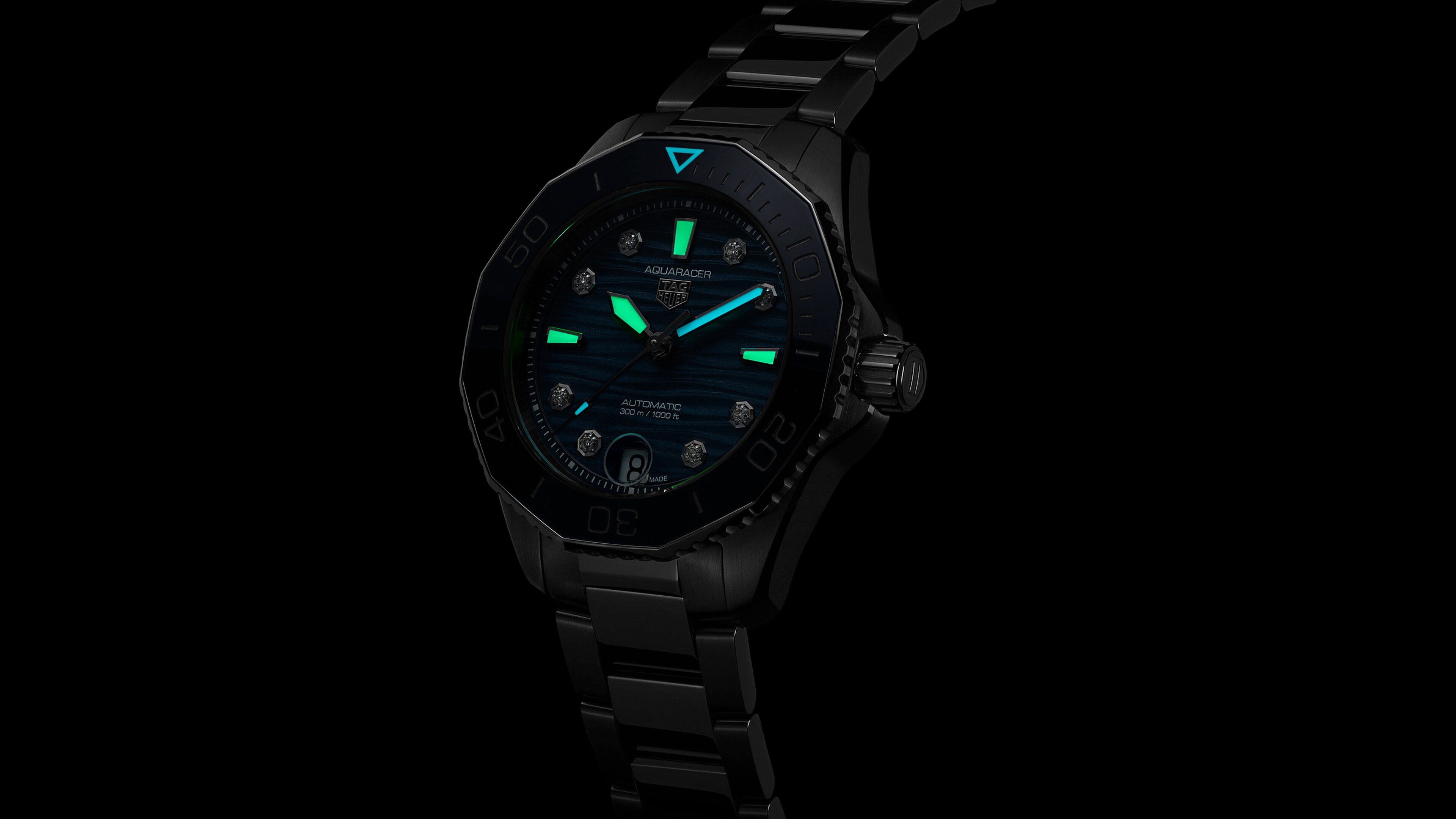 全新36毫米纤薄表壳延续TAG Heuer Aquaracer(竞潜系列)的经典传承,将磨砂抛光表面与锐利的几何图案巧妙融合。
