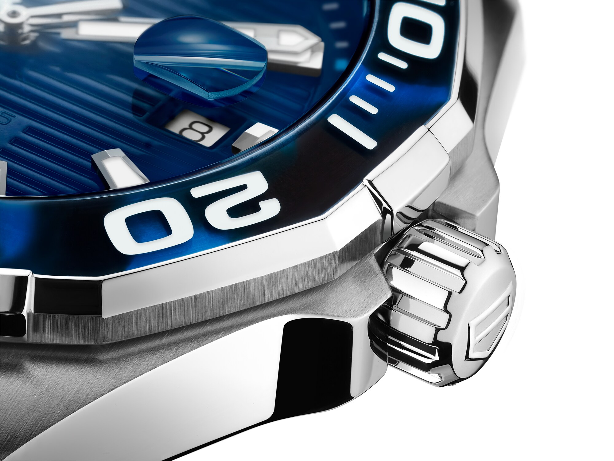 特殊的蓝色单向旋转表圈让人想起阳光在海面折射出的粼粼波光,蓝色鳄鱼皮格纹橡胶表带,打造精致外观。