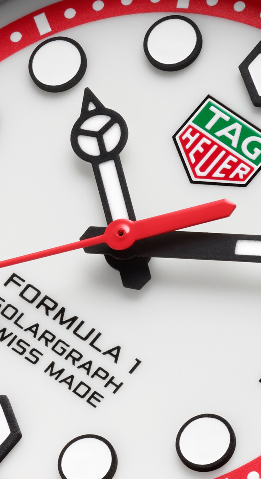 白色蛋白石表盘与黑色TH-Polylight表圈相得益彰,搭配醒目的红色外缘,整体外观活力十足。黑色漆面指针和时标涂覆Super-LumiNova®荧光涂料,确保无论昼夜皆能清晰易读。