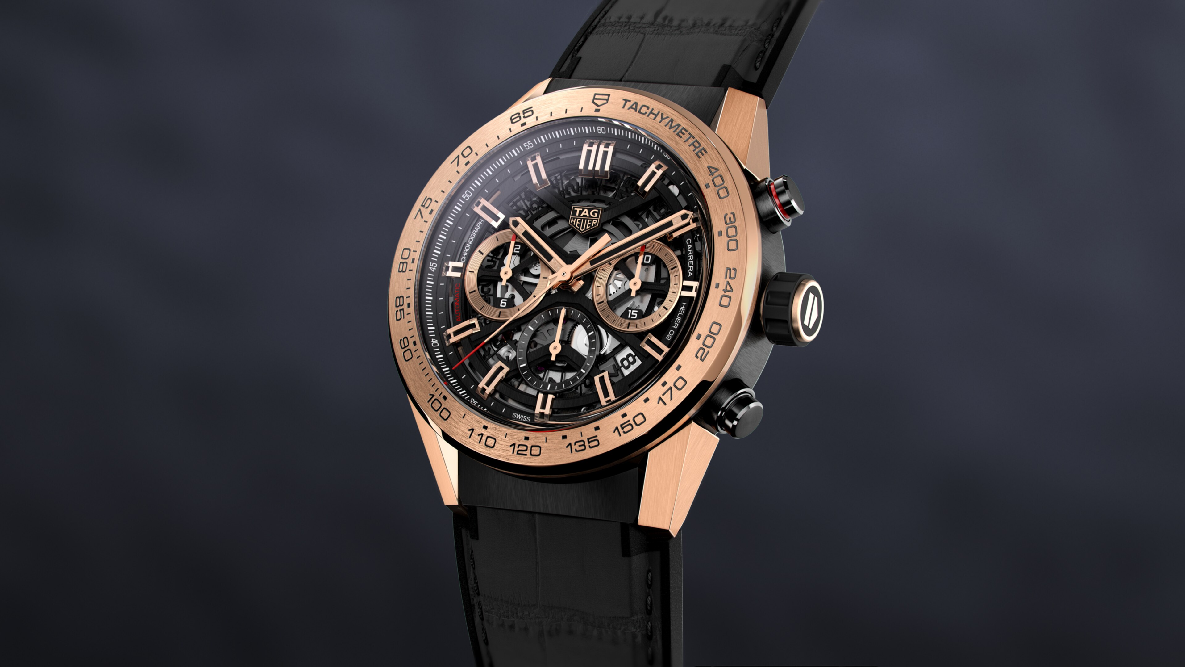 Curved sapphire crystal with double anti-reflective treatment protects the dial, which is housed in a 45mm black PVD steel case. The Manufacture automatic movement Heuer 02 can be seen through the sapphire case back, and provide a stunning 80 hours power reserve.