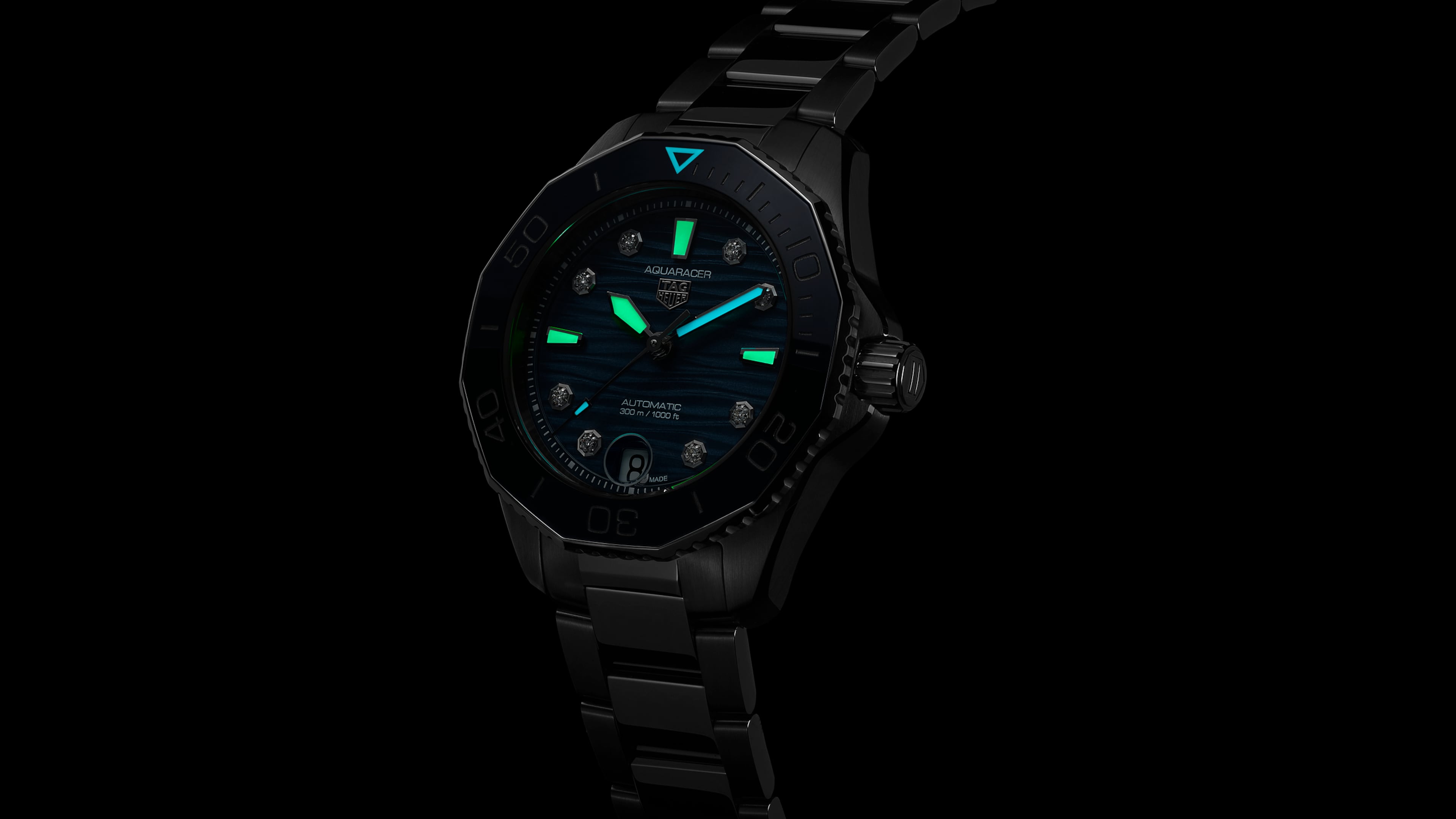 True to the iconic Aquaracer heritage, the new 36mm slim case combines brushed and polished surfaces with sharp geometry.
