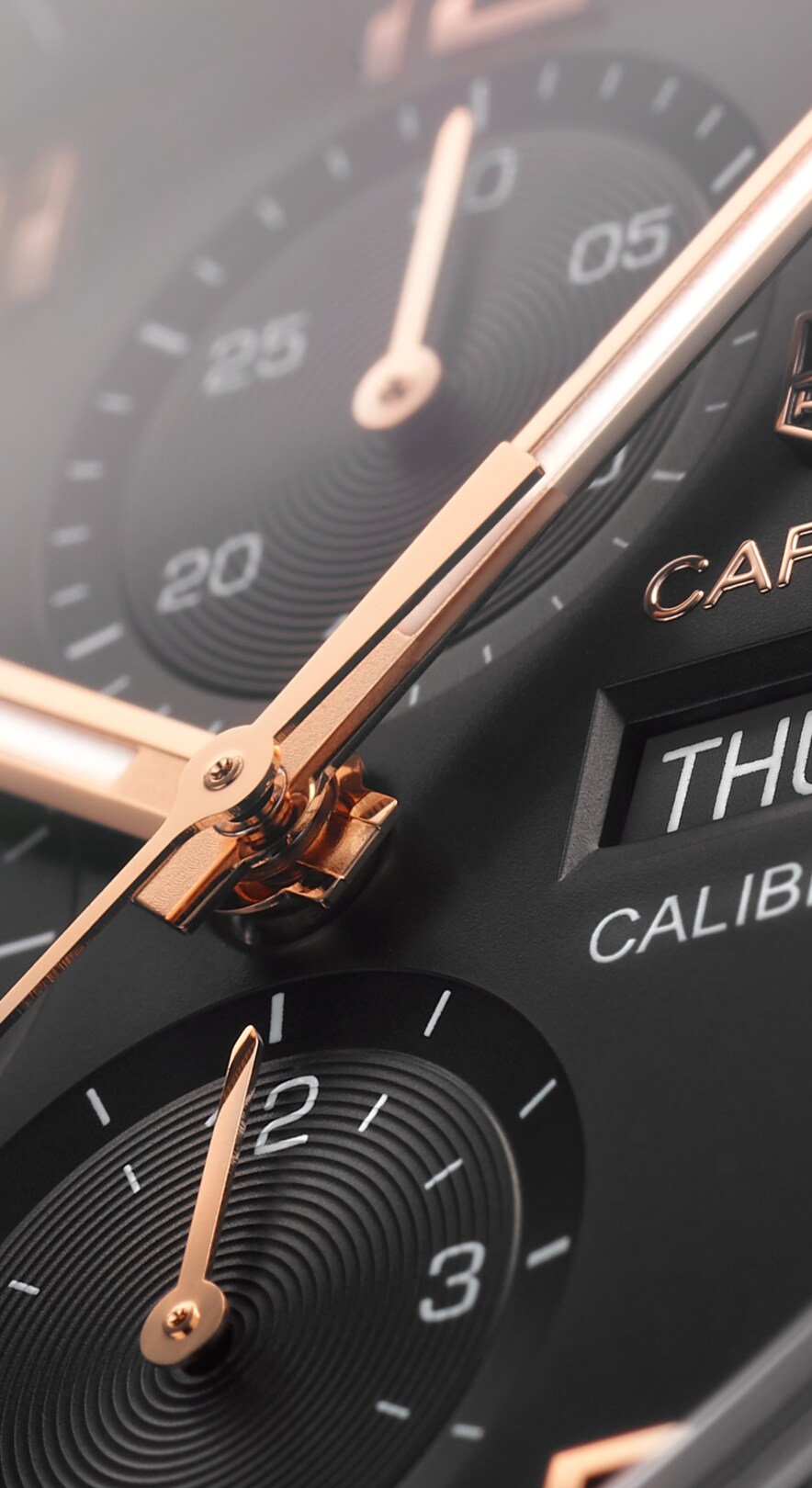 Les éléments en or rose ressortent sur leur cadran entièrement noir, y compris les six aiguilles, le bouclier TAG Heuer poli appliqué à la main et les grands chiffres faciles à lire.