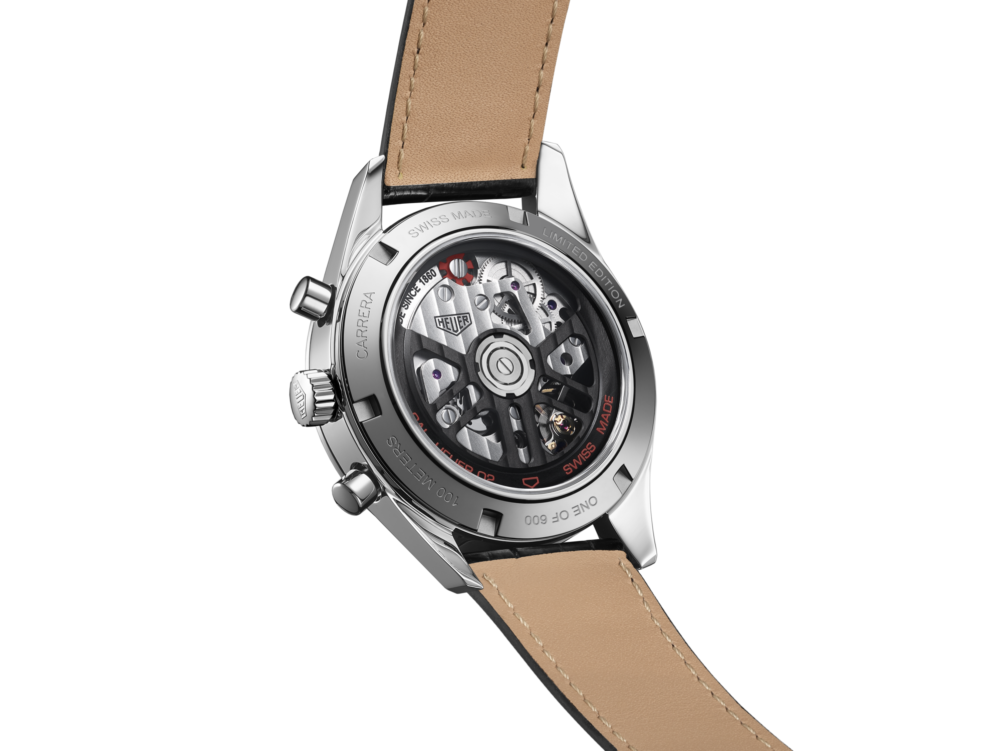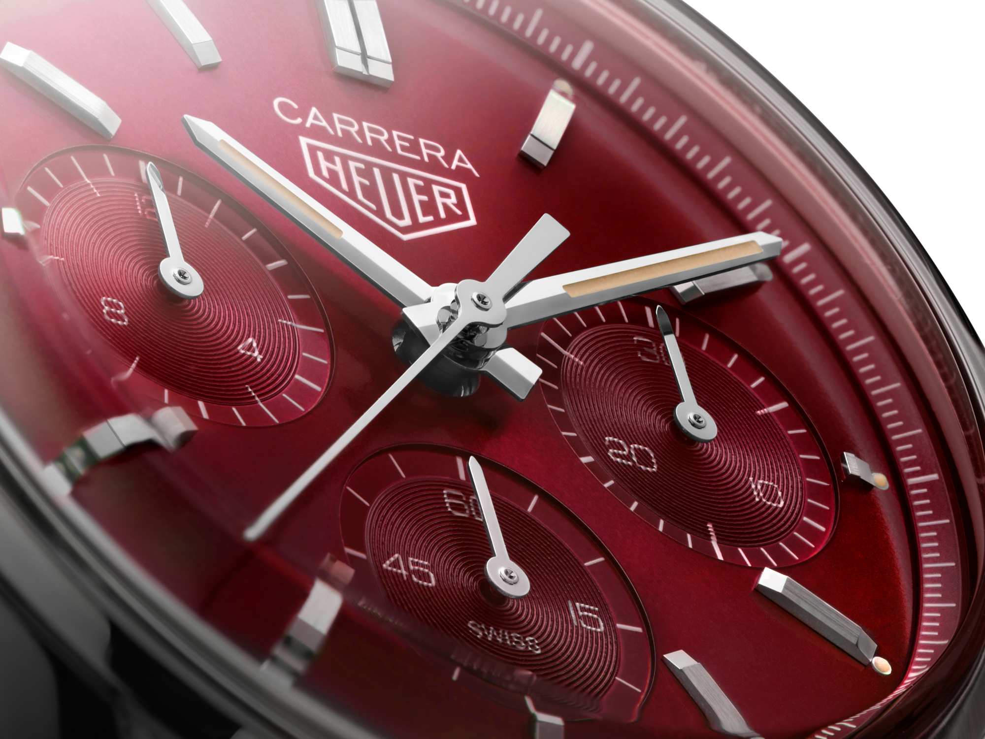 The bright red dial makes for a dramatic statement and features the printed Carrera name and Heuer crest, a tribute to a signature design.