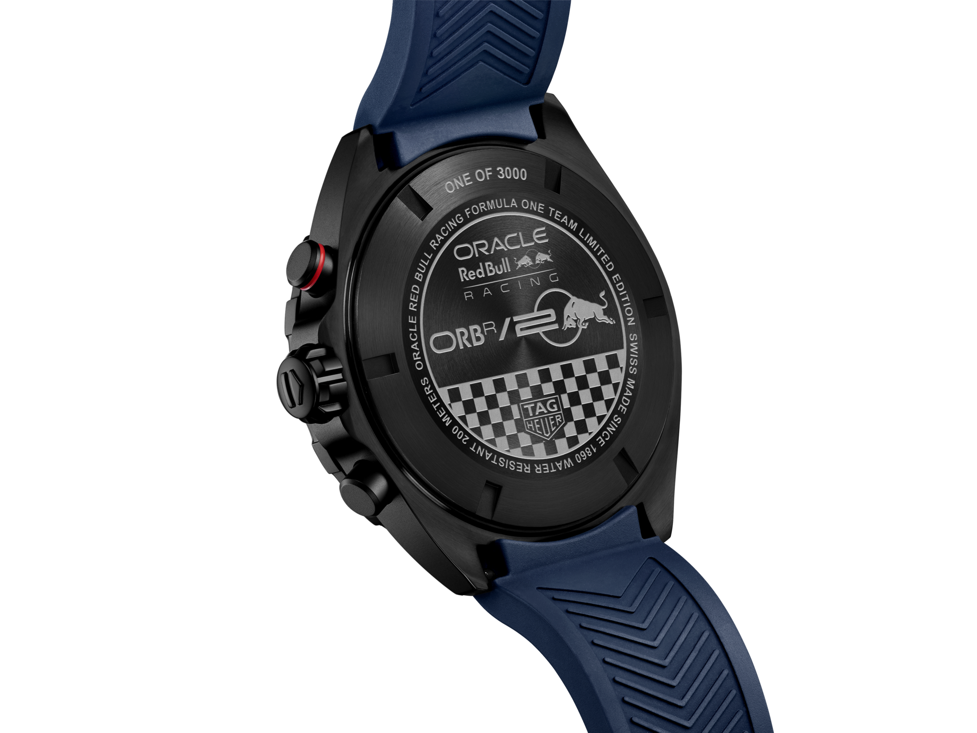 Complete with a blue rubber strap and the Oracle Red Bull Racing emblem on the caseback, this watch celebrates 20 years of success. The special 20th-anniversary logo and checkered flag motif etched on the caseback further cement its status as a collector’s piece.
