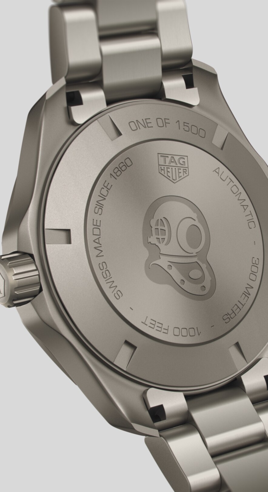 Automático, 43 mm, Titânio WAY208F.BF0638Um Aquaracer de Edição Limitada com mostrador preto desenvolvido em parceria com o Departamento de Relógios da Bamford. Limitado a 1.500 peças, este modelo apresenta uma caixa ultraleve de 43 mm, com um bezel rotativo unidirecional com escala de 60 minutos e um bracelete de três fileiras em titânio grau 2 altamente resiliente.