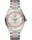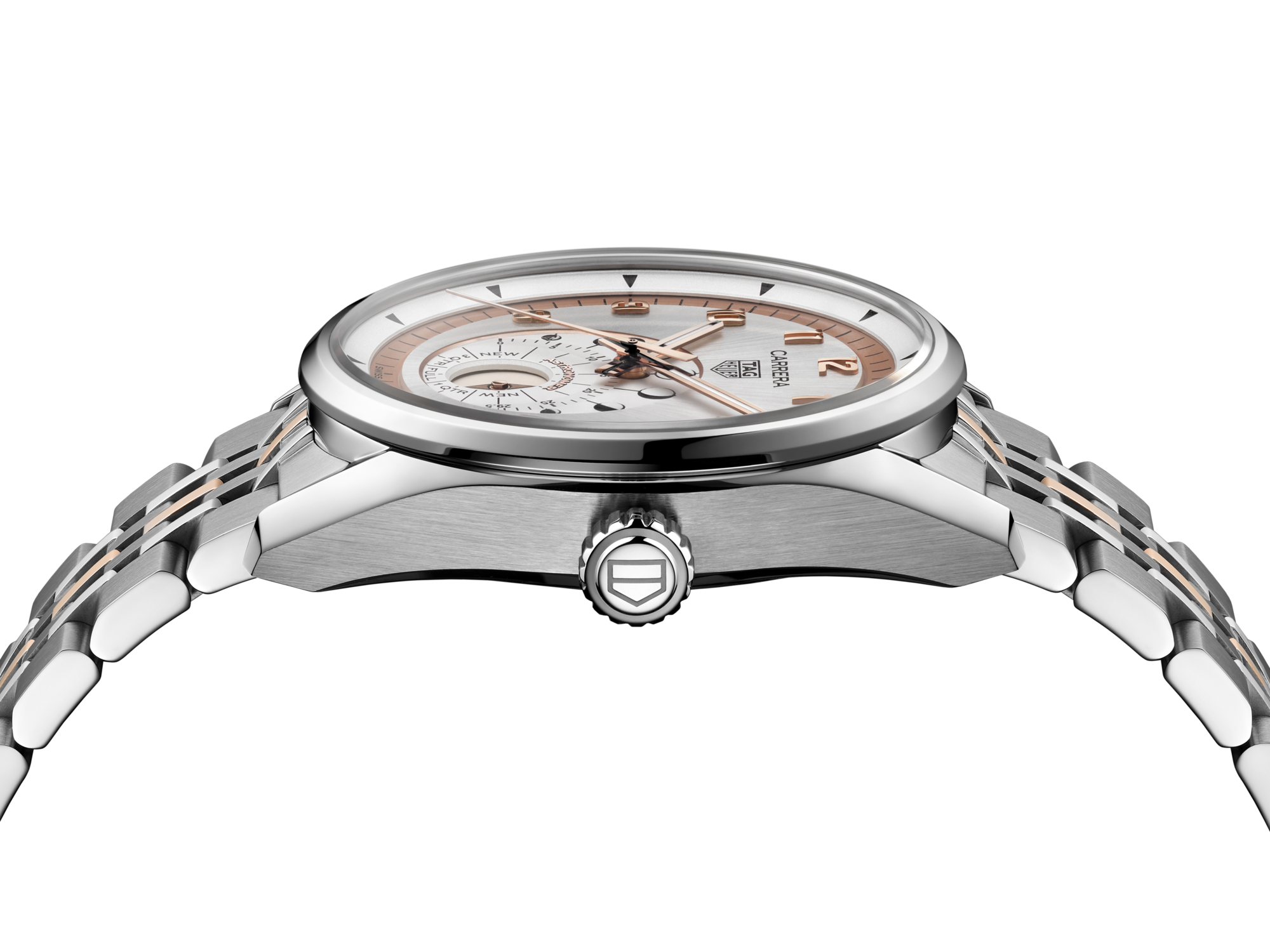 O mostrador prateado escovado com efeito sunray é realçado por algarismos, ponteiros e flange revestidos em ouro rosé 18K 5N, criando um contraste refinado e vibrante. No centro, o contador às 6 horas apresenta um disco prateado de fases da Lua com marcações detalhadas, que dão vida ao ciclo lunar.