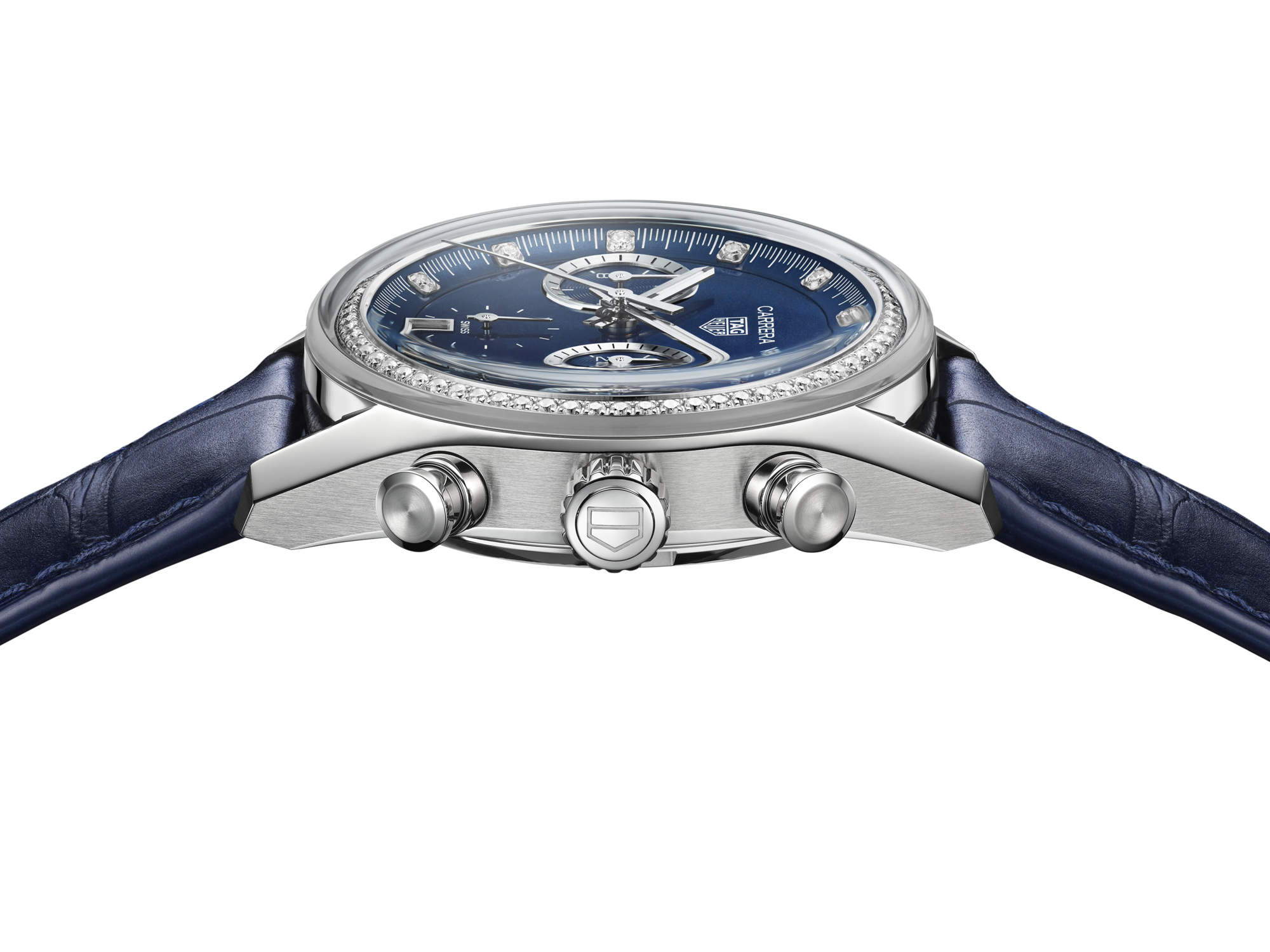 A luxuosa textura da pulseira em couro de crocodilo azul-escuro deste relógio inovador oferece um contraste tátil com o brilho do aço e do diamante.