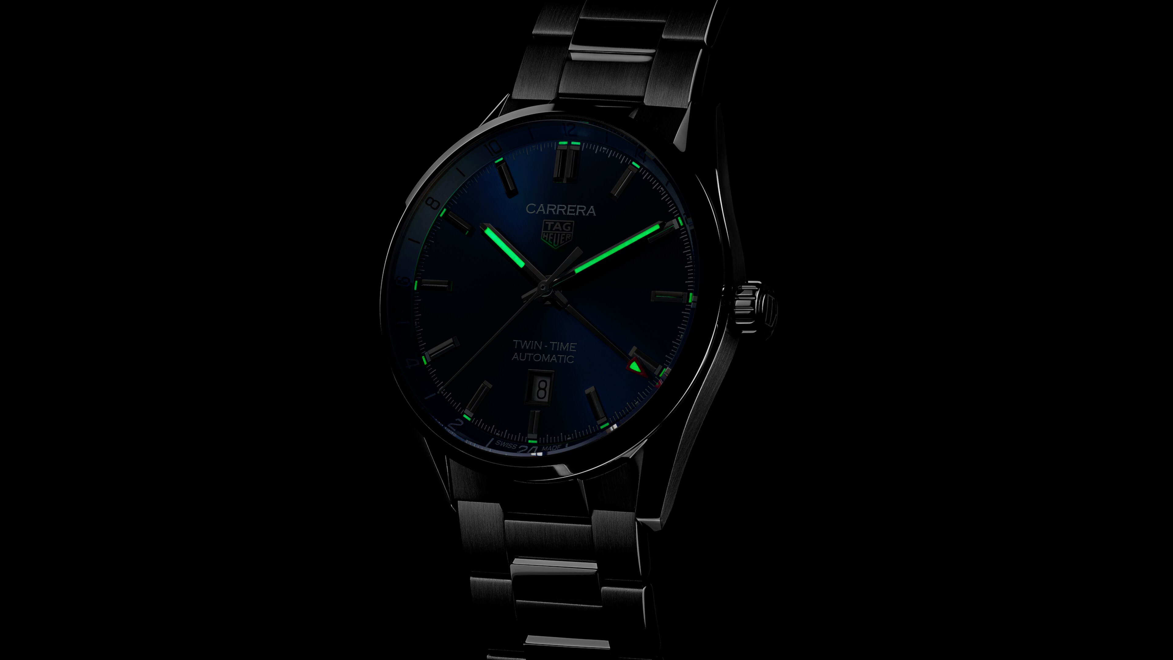 Apresentando um mostrador azul com efeito sunray, este TAG Heuer Carrera Twin Time se destaca com ponteiros mais ousados e índices revestidos em ródio com Super-Luminova®.