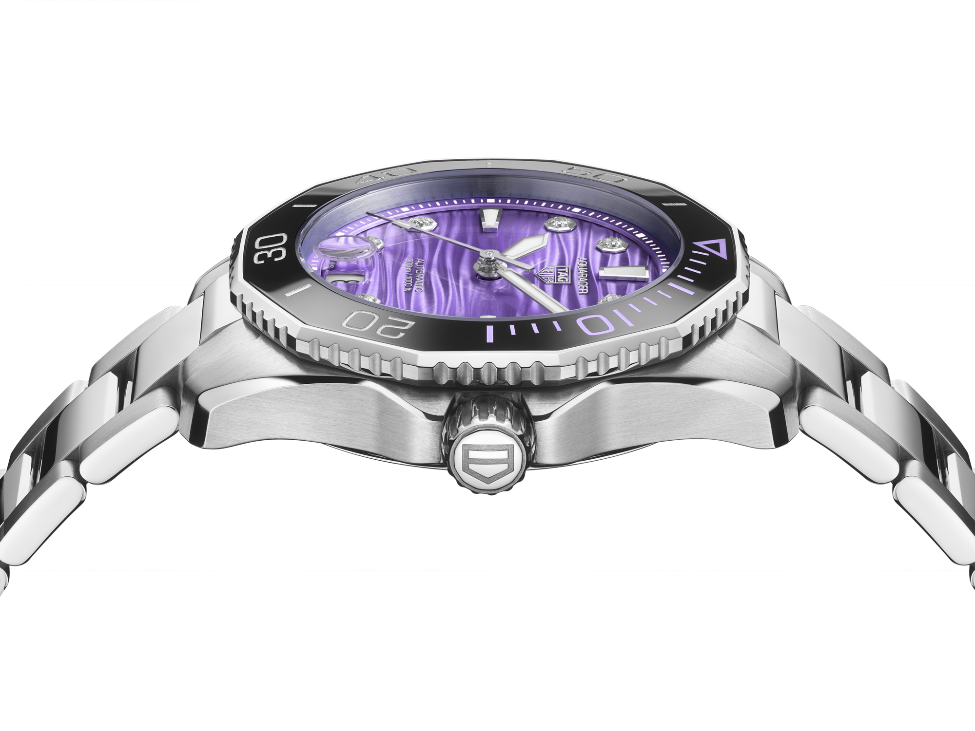 The TAG Heuer Aquaracer Professional 300 Date is inspired by the vivid colors of coral reefs found in the depths of the ocean. With its striking purple dial and diamond accents, this dive watch fuses elegance with rugged functionality, designed to thrive in the depths and dazzle onshore.
