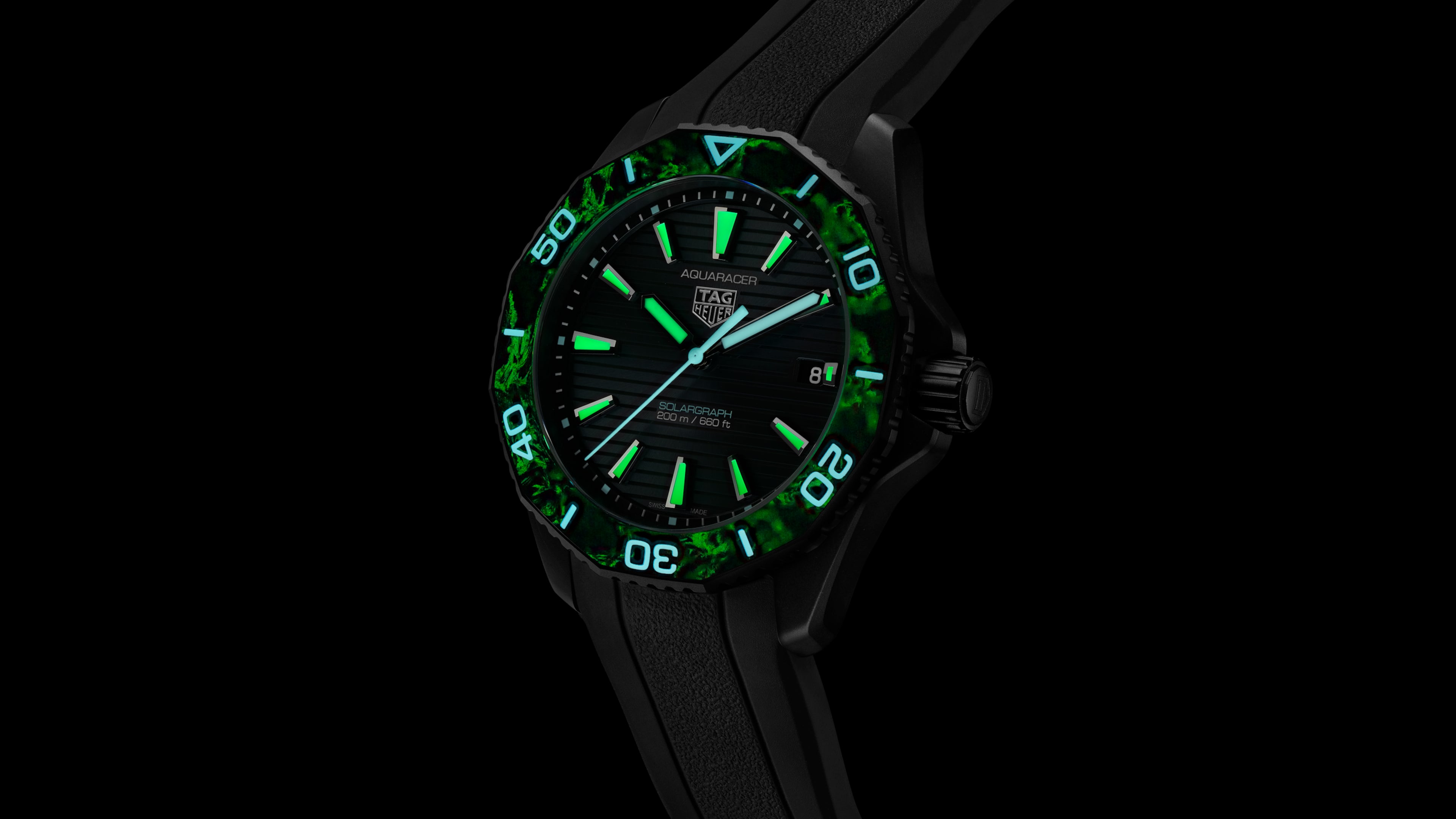 A standout feature of this TAG Heuer Aquaracer is its bezel inserts, made from carbon fused with luminous material for maximal legibility, day and night.