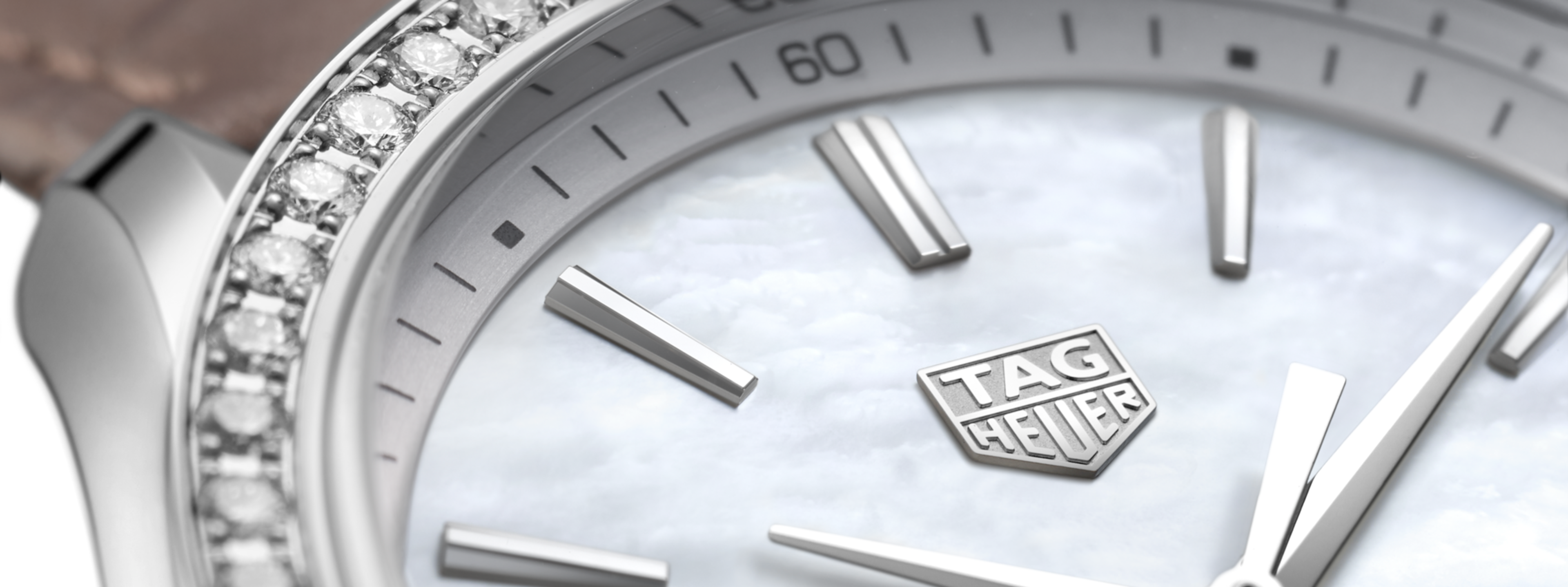 Quartz, 36 mm, Steel WBK1316.FC8258A stunning quartz-powered TAG Heuer Carrera Lady with a brown alligator strap, and a luminous dial of white mother of pearl. The steel bezel is set with 54 shimmering diamonds.
