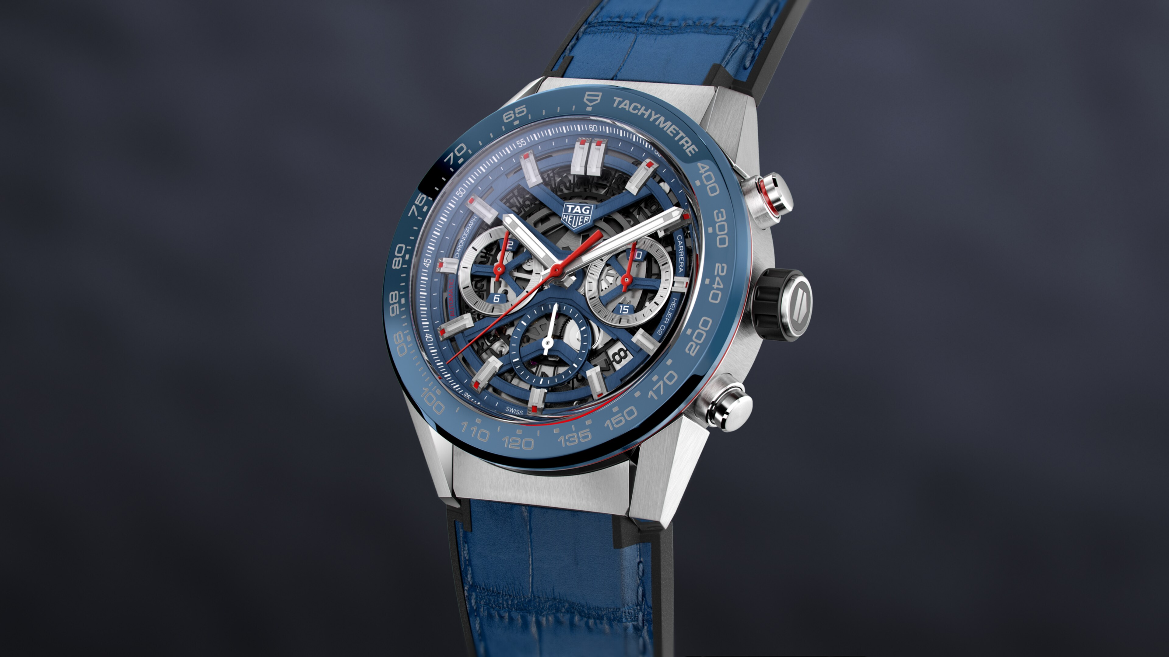 Automatic, 45 mm, Steel CBG2A11.FC6460This TAG Heuer Carrera chronograph with blue skeleton dial in a larger, 45mm steel case. The collection’s unique motor-racing heritage is expressed by a strap in blue alligator with black rubber lining.
