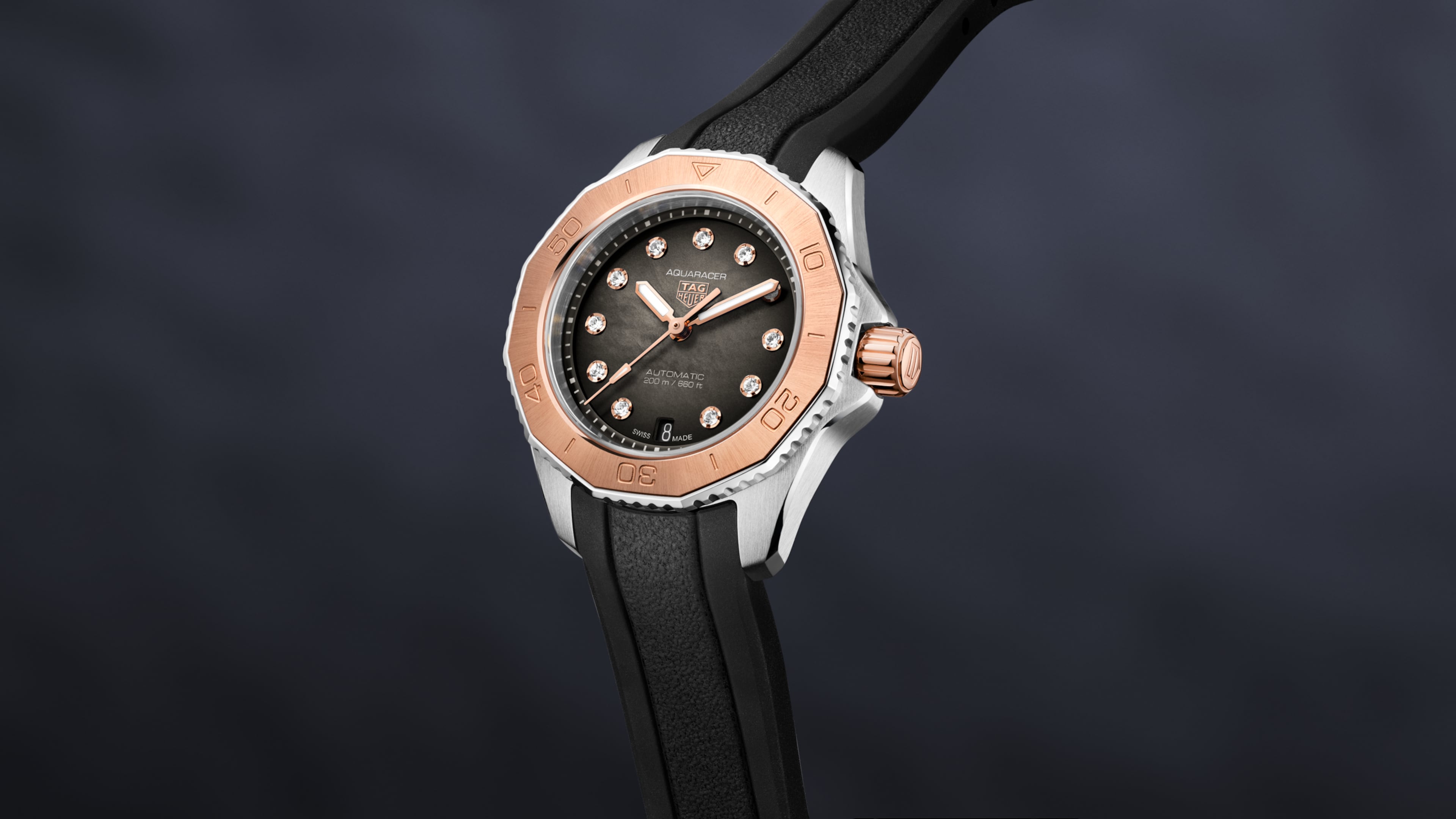 Automatique, 30 mm, Acier WBP2451.FT6200Entre or rose massif 18K 5N et diamants VS de 1,4 mm de diamètre (0,107 ct), cette TAG Heuer Aquaracer dont chaque détail respire l'élégance associe un cadran noir fumé à un robuste bracelet en caoutchouc assorti pour vous accompagner toujours plus loin.