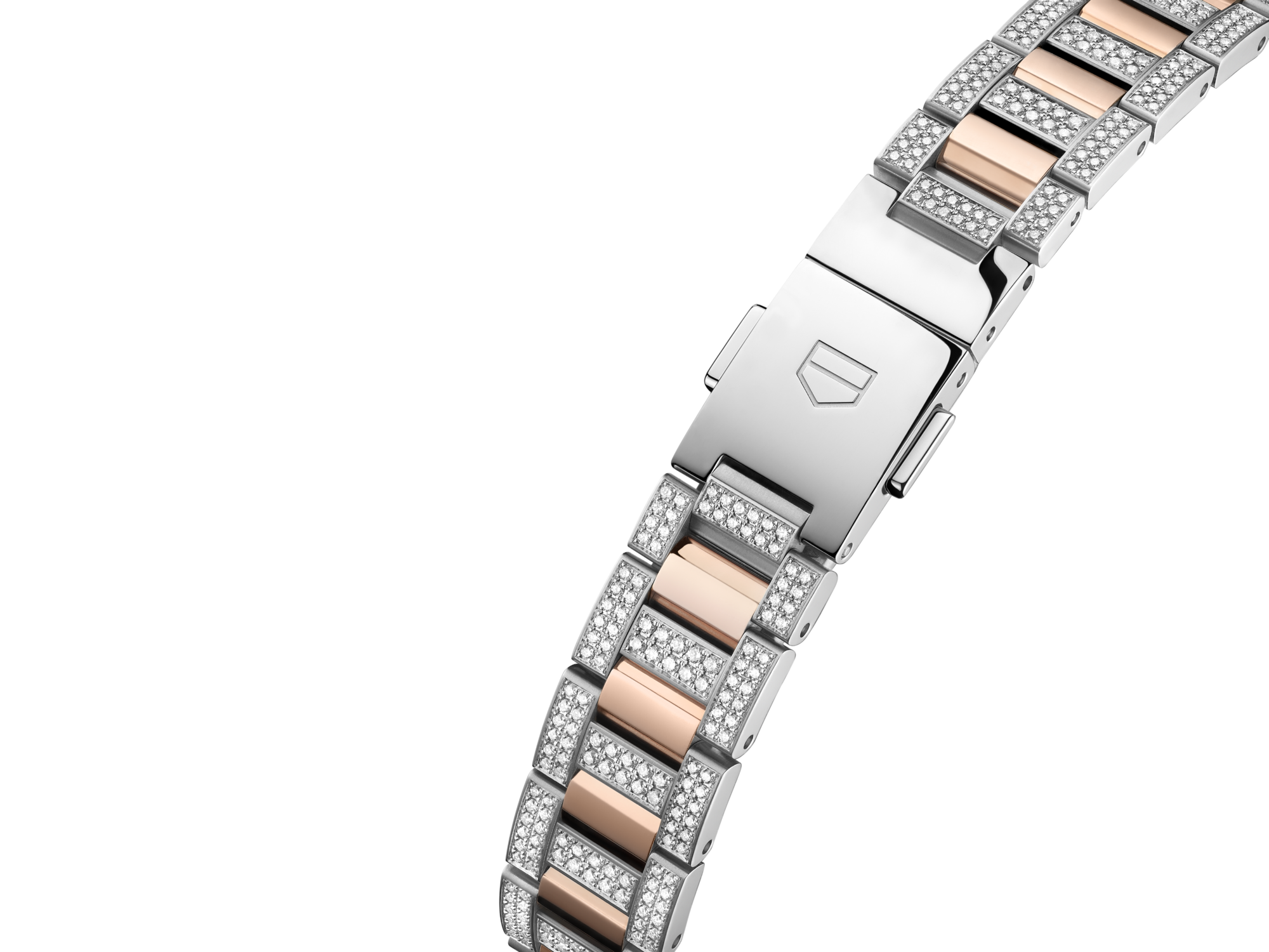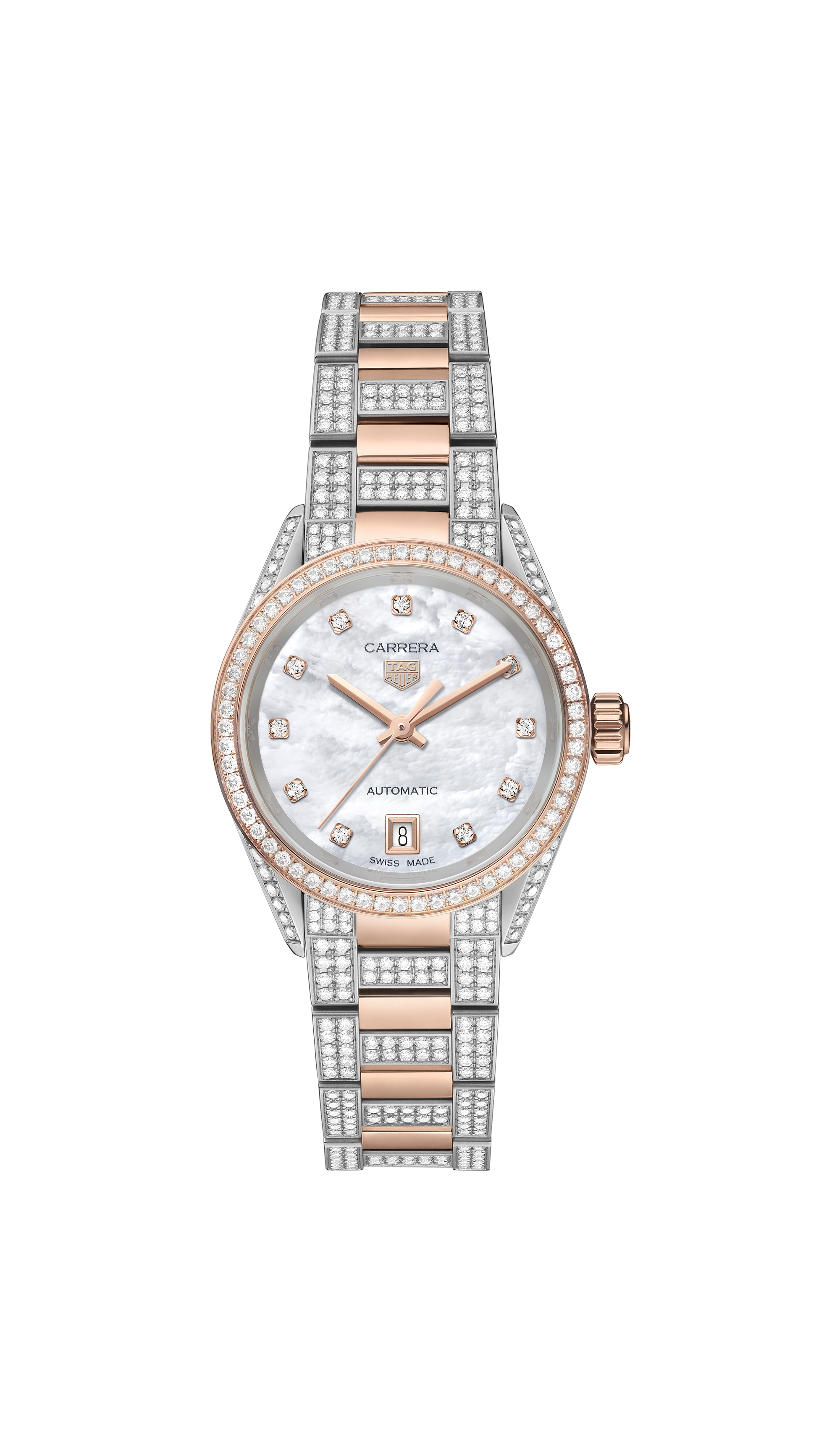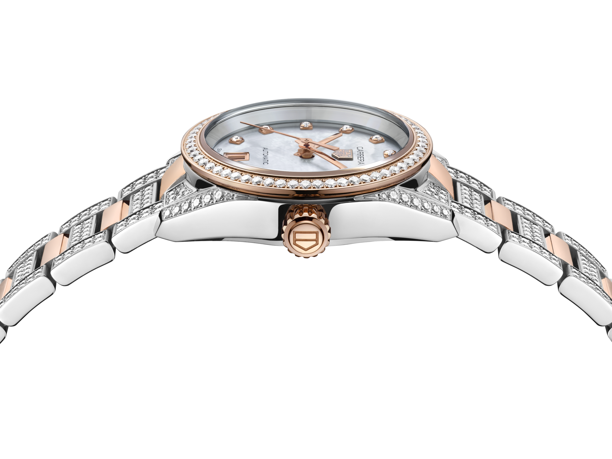 Cette TAG Heuer Carrera de 29 mm avec un boîtier en acier et or rose est sertie de diamants sur la lunette, le boîtier et le bracelet. Une élégance ambitieuse dans toute sa splendeur.