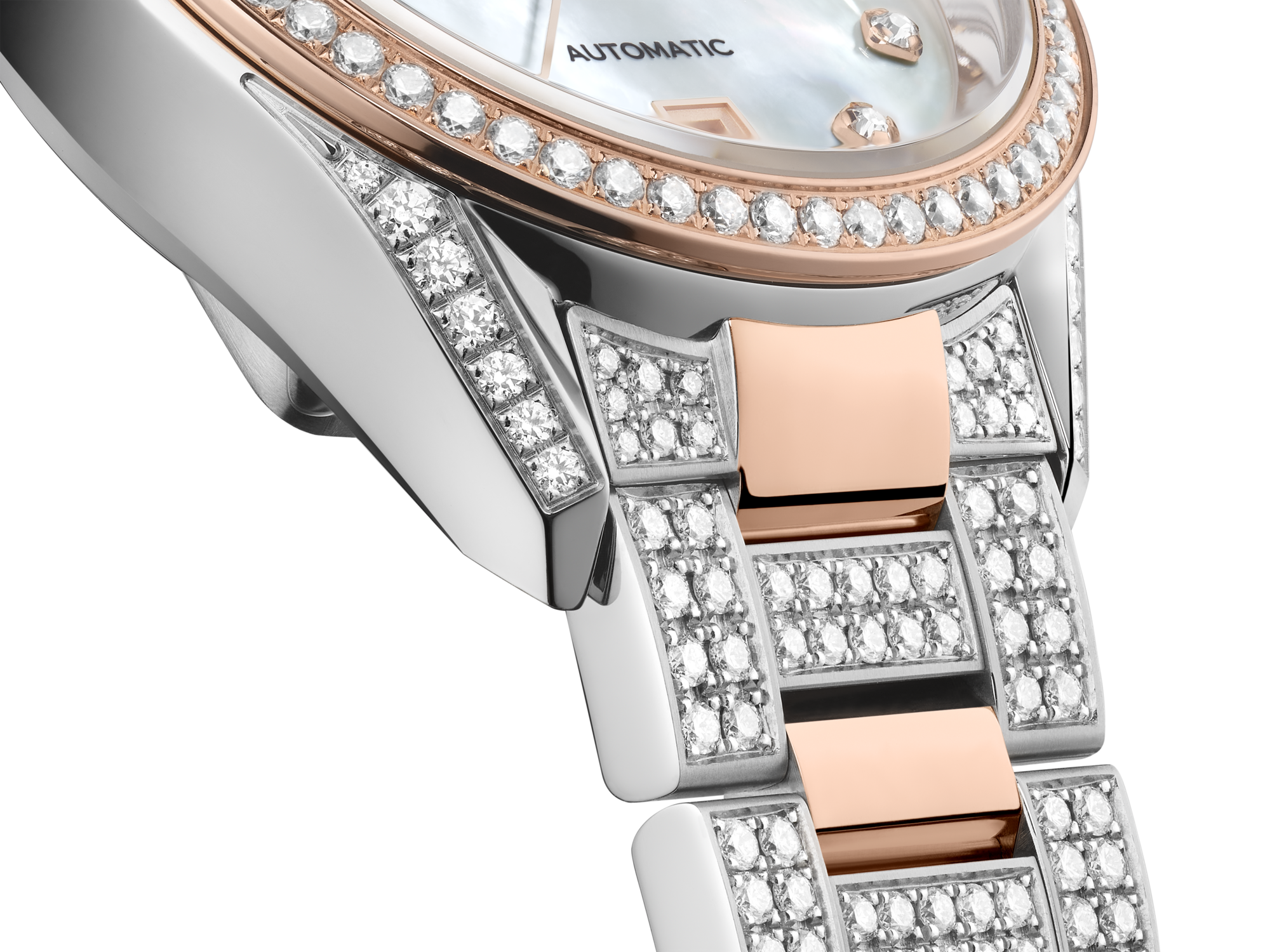 Le luxueux cadran est assorti au boîtier. Fabriquée en nacre et sertie de 11 diamants de 1,30 mm, soit 0,088 carats, elle a le sens du spectacle.