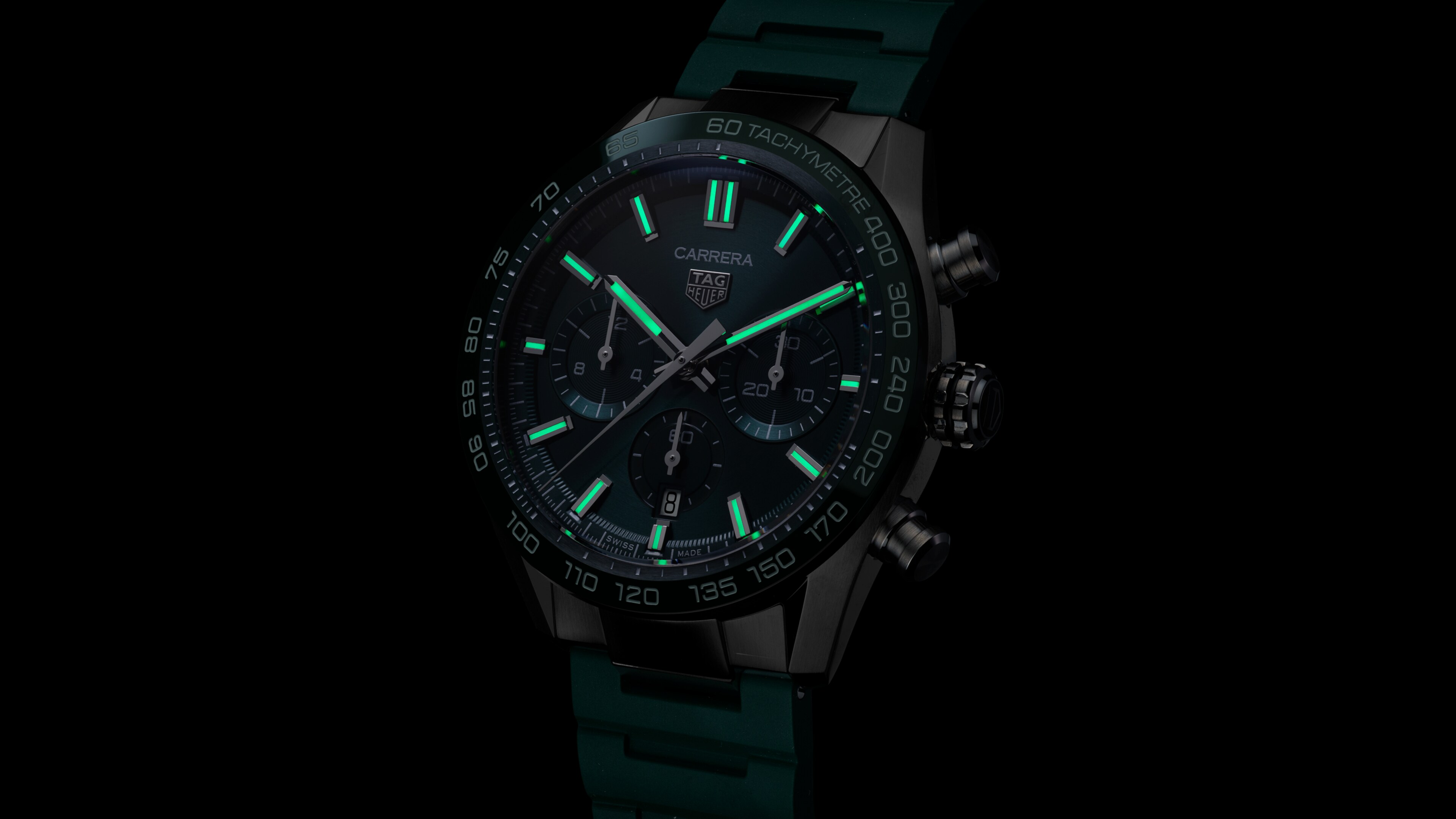 Le cadran circulaire vert satiné se conjugue à une lunette tachymétrique en céramique ton sur ton et à un bracelet en caoutchouc vert pour un rendu époustouflant.