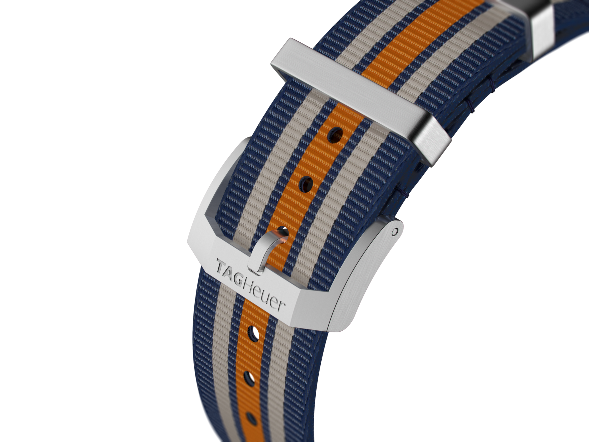 Quartz, 43 mm, Acier CAZ1014.FC8196Un chronographe de sport de 43 mm avec cadran bleu, lunette avec échelle tachymétrique en aluminium sablé bleu et disposition classique des compteurs du chronographe en 3-6-9. Le bracelet NATO est bleu avec une bande orange centrale et deux bandes grises latérales.
