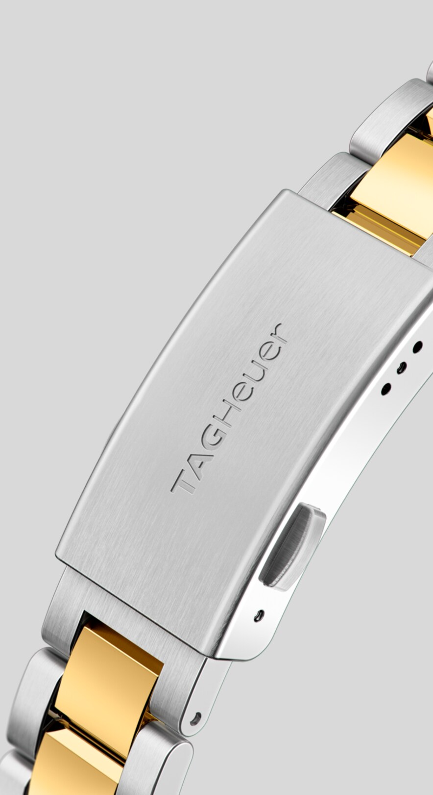 Das legendäre, dreireihige Armband der Aquaracer in den zwei Tönen Edelstahl und 18 K 2N Gelbgold.