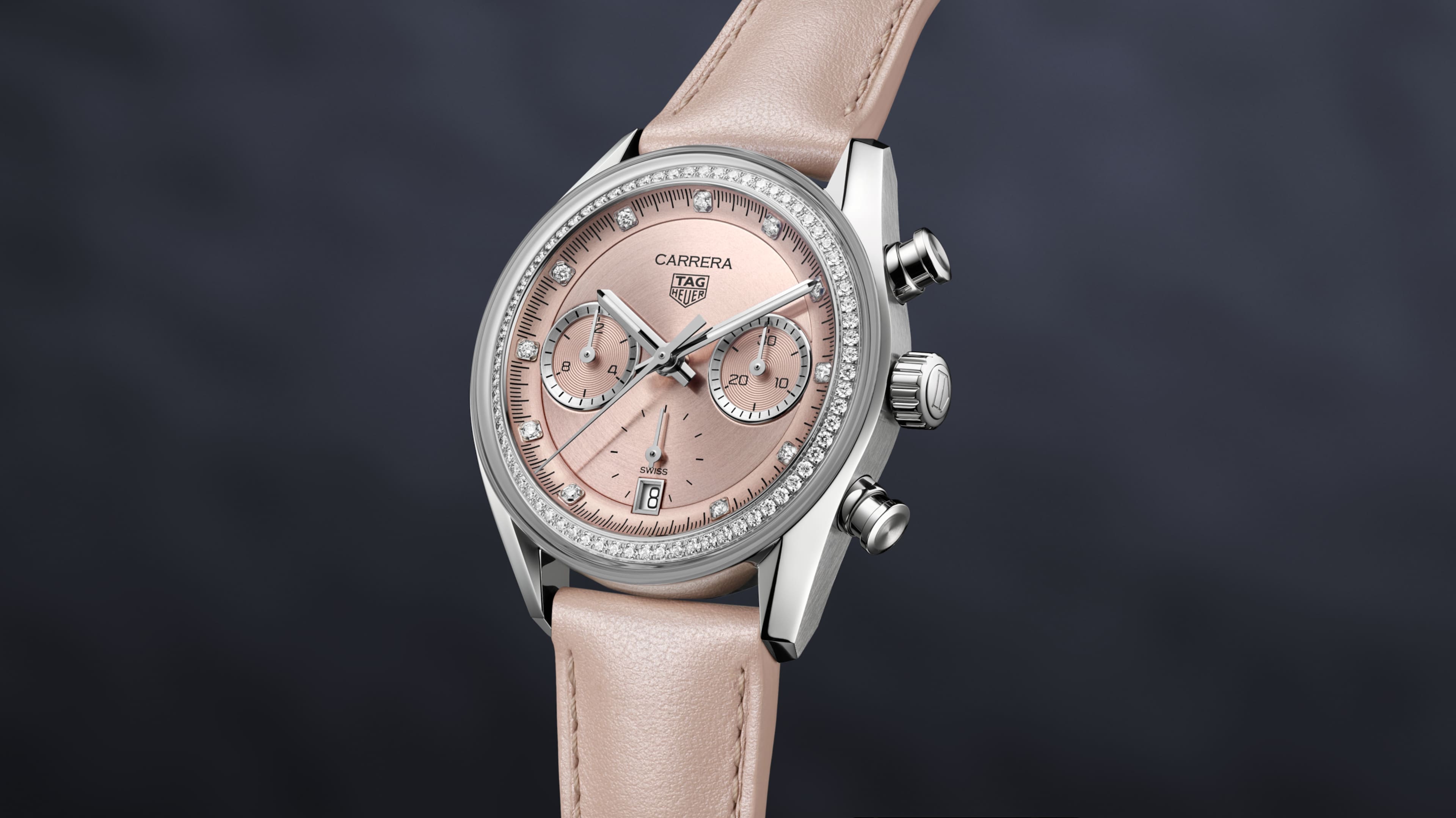 Automatik, 39 mm, Edelstahl CBS2215.FC6568Dieser TAG Heuer Carrera Chronograph mit 39 mm großer Silhouette verkörpert Weiblichkeit und Rennsportgeist. Sein zartrosa Zifferblatt und der Glanz der Diamanten schaffen eine luxuriöse und sportliche Ästhetik.