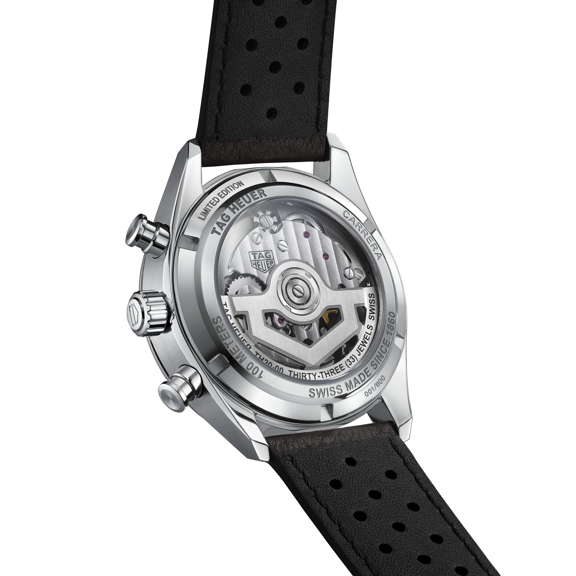 Das intern gefertigte Chronographenwerk TH20-00, versehen mit einer 80-stündigen Gangreserve, ist durch den transparenten Gehäuseboden sichtbar. Limitiert auf 600 Exemplare.