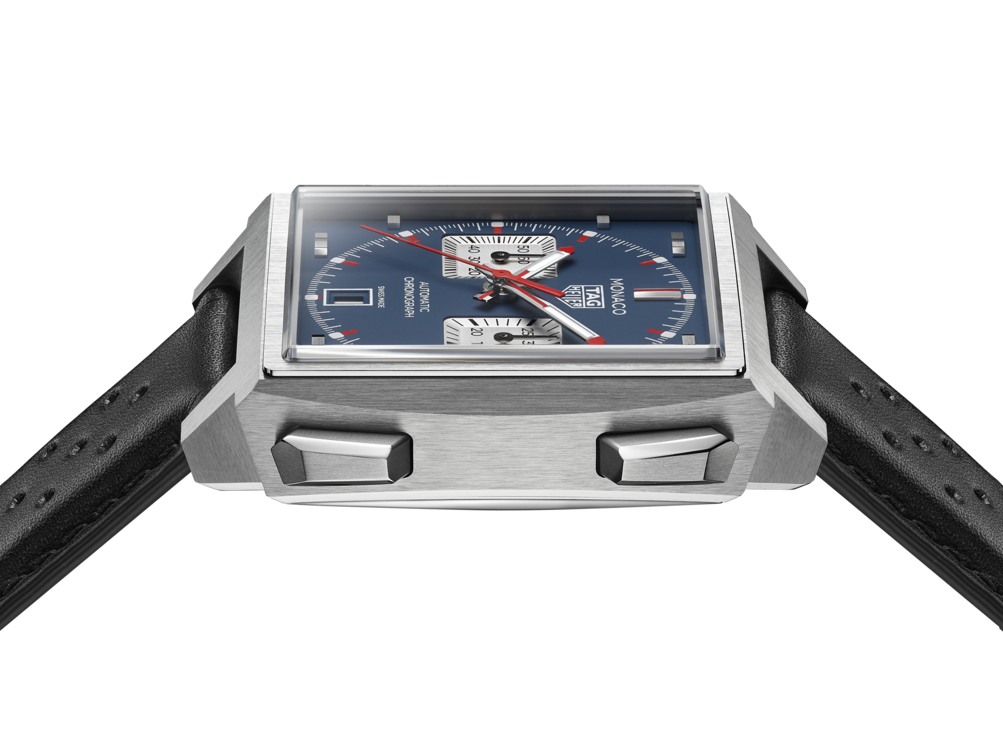 Ein schwarzes, durchbrochenes Kalbslederarmband – eine Hommage an die Vintage Heuer Monaco – garantiert Tragekomfort und unterstreicht den sportlichen Charakter der Uhr. Die Faltschließe aus Titan Grad 5 ist mit doppelten Sicherheitsdrückern ausgestattet und sorgt für optimalen Halt und ein perfektes Gleichgewicht zwischen Robustheit und Raffinesse.