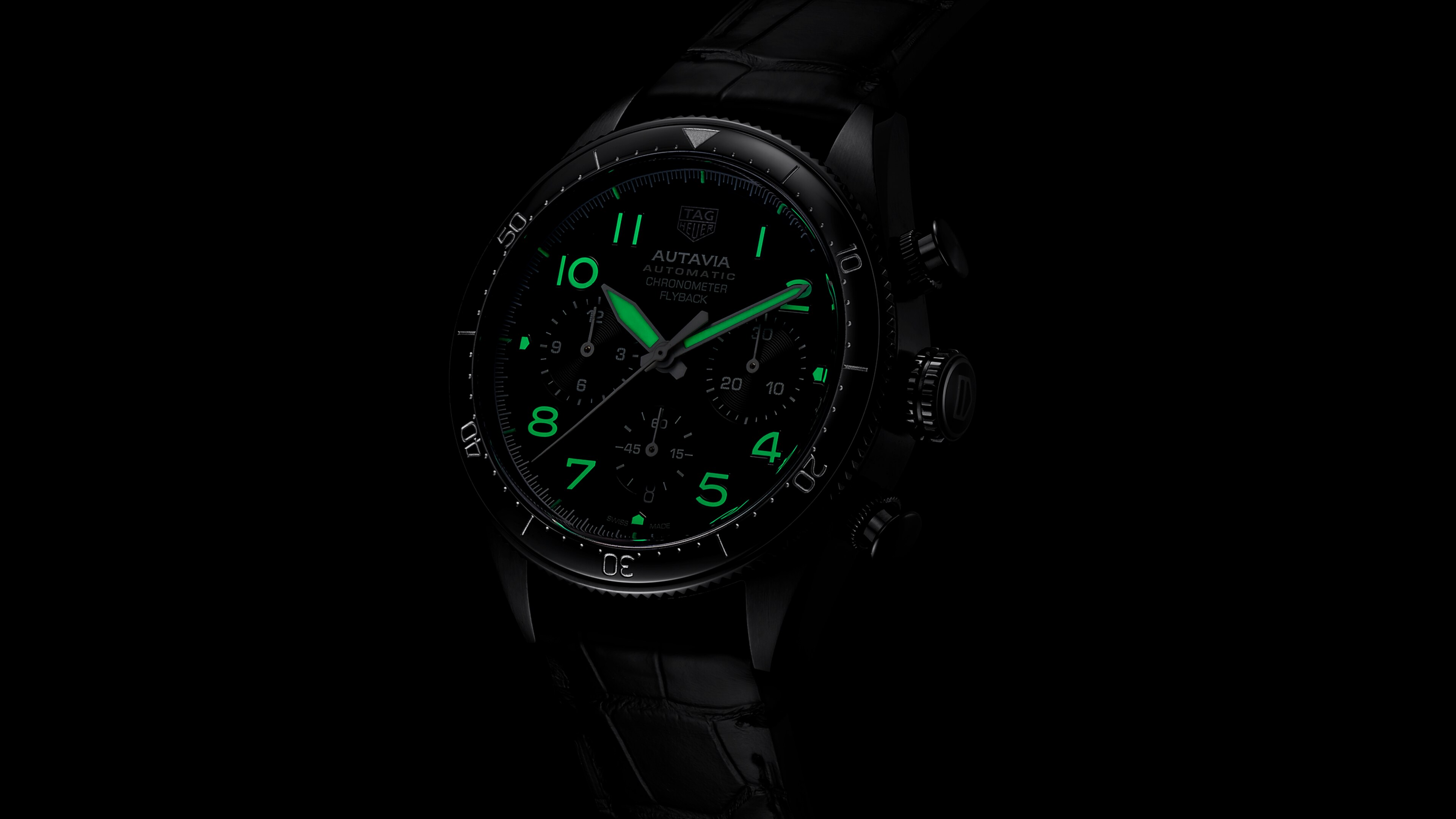 Le cadran noir saisissant doté de compteurs assortis est rehaussé d'une lunette bidirectionnelle en céramique noire. Les aiguilles et les index appliqués revêtus de Super-Luminova® offrent une lisibilité rapide.