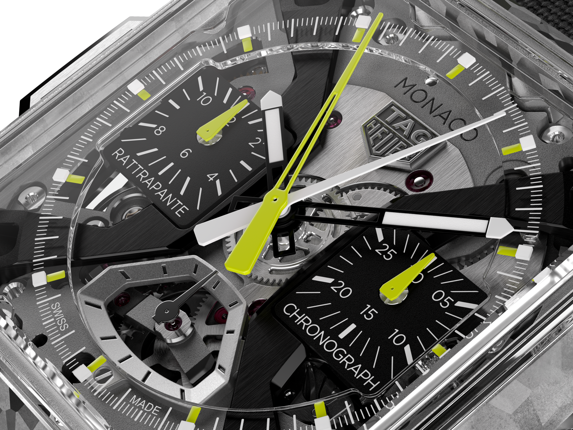 双秒追针计时功能可为两件同时发生的事件精准计时。黑色蛋白石计时盘与点缀柠檬绿细节的指针形成鲜明对比,不仅突显了腕表动感十足的设计风格,即便在高速运动中亦能确保清晰读时。