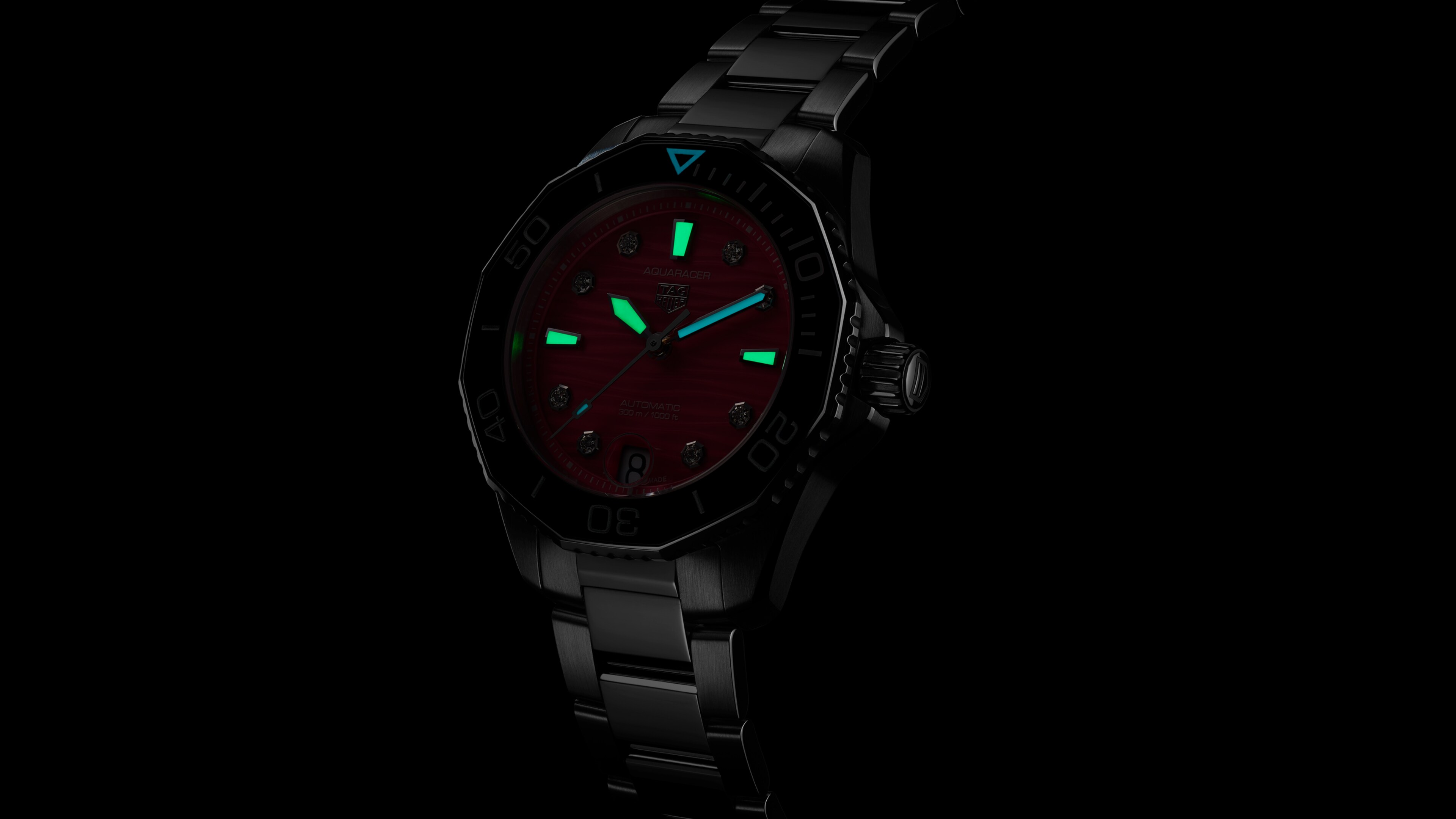 Il motivo ondulato del quadrante del TAG Heuer Aquaracer spicca in un vivace colore rosa, incorniciato dalla lunetta in ceramica nera e impreziosito dagli indici in diamanti VS del diametro di 1,40 mm e 0,07 carati.