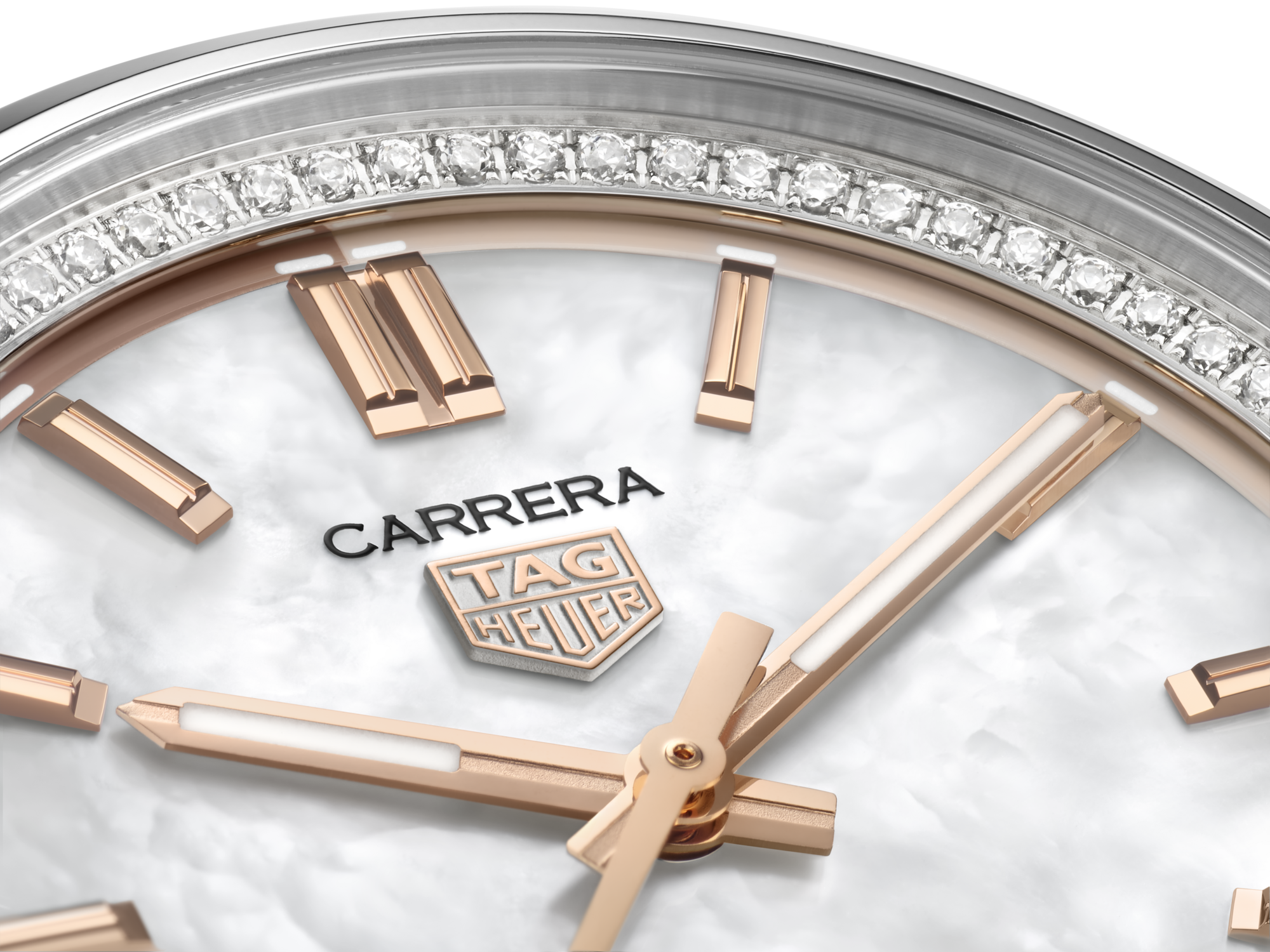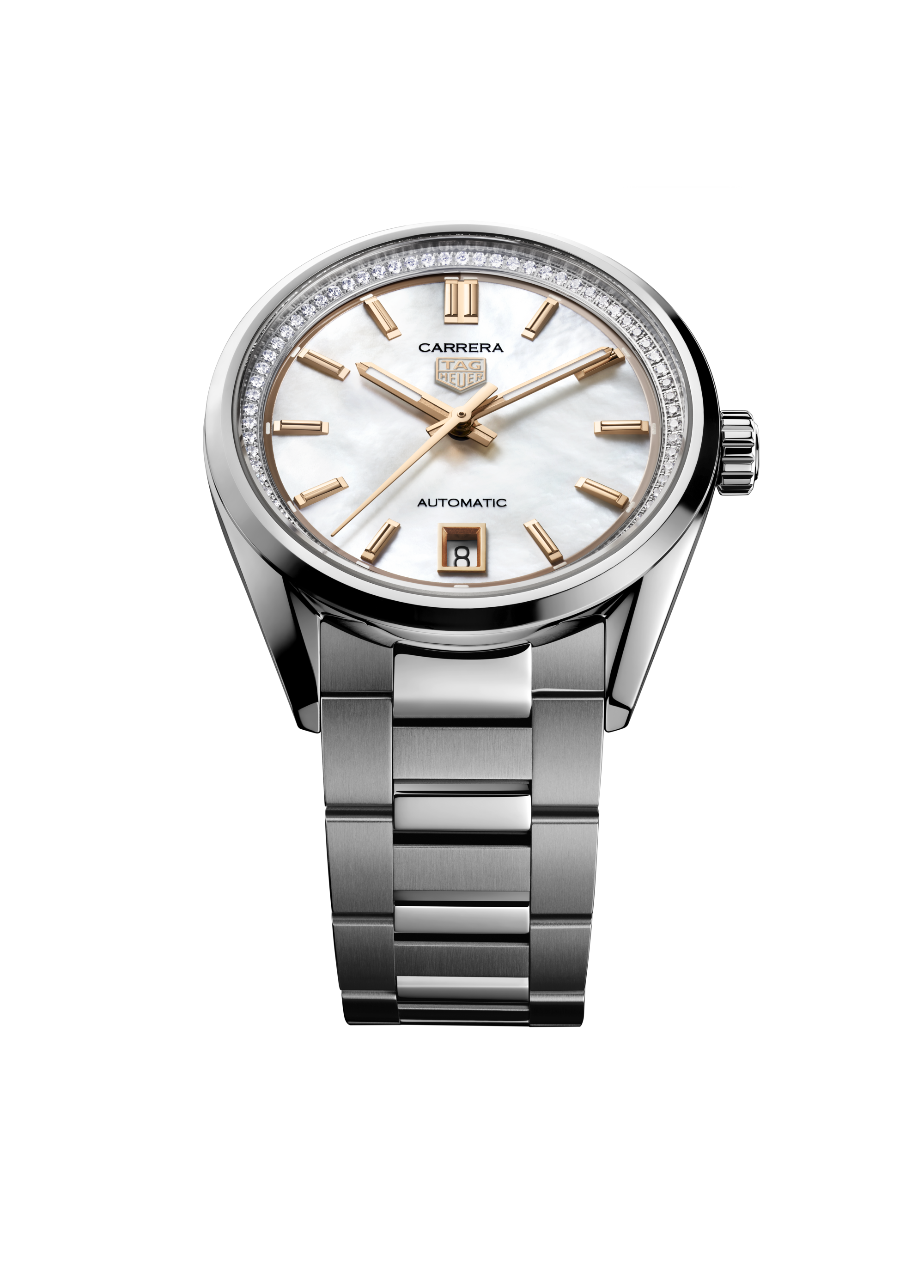 Il quadrante in madreperla bianca è incorniciato da un radioso rehaut decorato con 76 diamanti (0,288 carati), mentre le lancette e gli indici placcati oro rosa 18 carati 5N donano maggiore sofisticatezza.