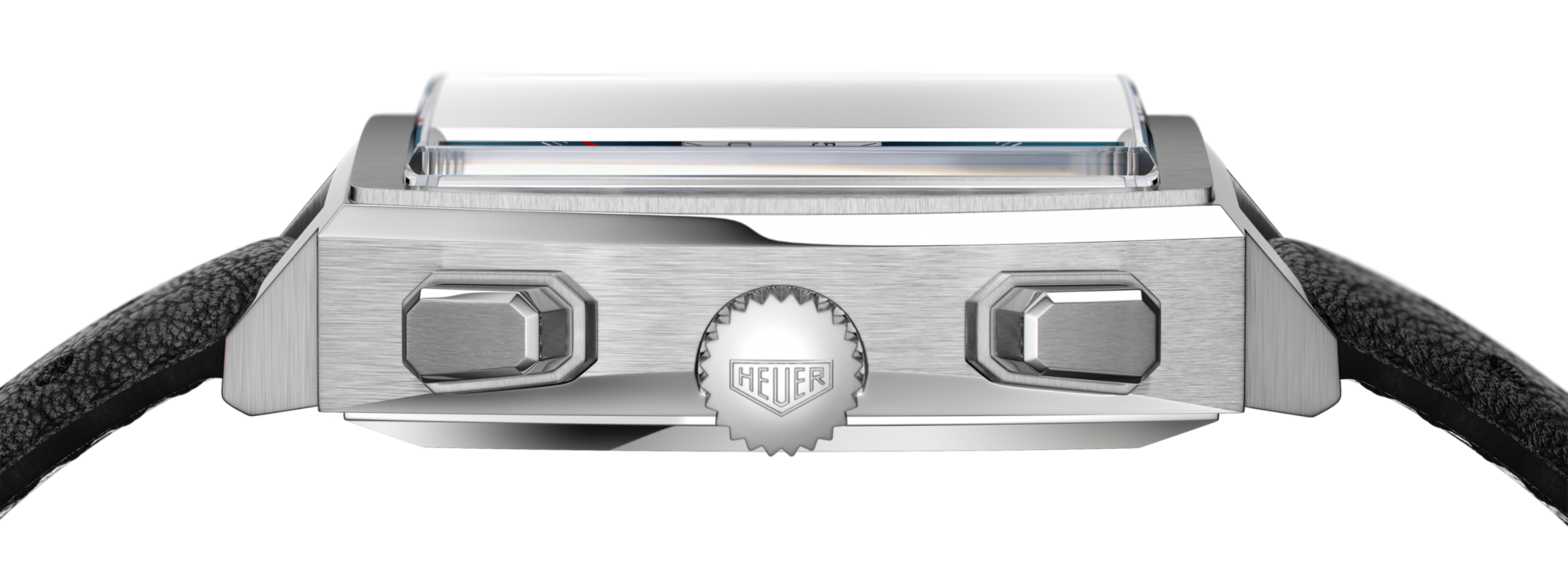 La cassa quadrata da 39 mm è in acciaio spazzolato con angoli smussati, anse, corona e pulsanti del cronografo lucidi. I due contatori quadrati presentano lancette rosso sangue, contatore dei 30 minuti a ore 9 e dei piccoli secondi a ore 3. Per un look old-school ma ancora attuale.